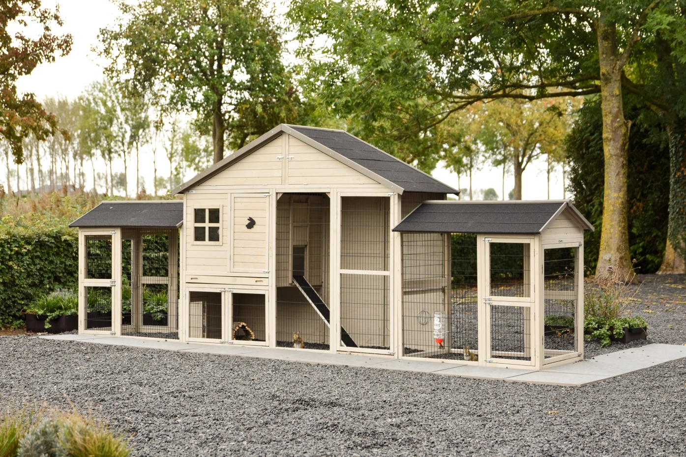 Le clapier Holiday Large avec enclos est un modèle beau, grand et très pratique. À ce clapier sont attachés deux enclos supplémentaires, offrant aux lapins encore plus d’espace pour se déplacer. Ce grand clapier dispose d’un abri de nuit et d’un enclos spacieux. Le clapier Holiday Large convient pour héberger de grands lapins, même le bélier français et le géant flamand. L’abri de nuit est équipé d’un tiroir coulissant pour un nettoyage facile.