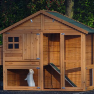 Le bois utilisé pour le loft est un produit naturel unique qu'a été produit dans le pays d'origine, après une sélection rigoureuse, dans une manière traditionelle. C'est caractéristique et unique à tous égards. Ce produit en bois a été un traitement manuel. Aucune pièce de bois ne possède la même forme, la même structure ou la même couleur, de sorte que les nuances de couleur sont inévitables, même dans un morceau de bois. Les fissures dues au vent, les craquelures, les imperfections et la présence de gros et de petits noeuds témoignent de leur origine et de leurs années de croissance. Les bosses sont généralement mises à jour manuellement avec du bois. Grâce à leur utilisation et à l’influence de la lumière, les nouveaux maisons pour animaux auront une couleur plus chaude au fil du temps. Les différences de couleur au modèle d'exposition sont donc possibles. L'enclos pour animaux est munie d'un fini antitache dans les couleurs comme sur la photo. Vous devez encore décaper le bois pour éviter les moisissures et la pourriture. Vous pouvez facilement commander des taches directement.