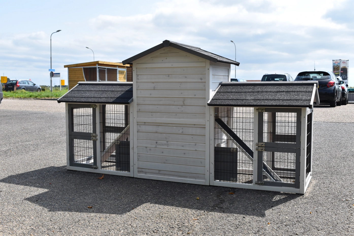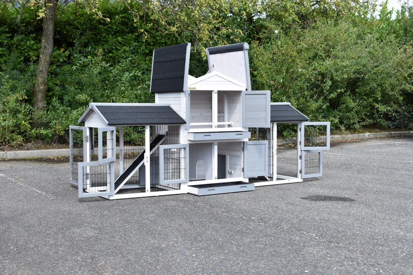 Le beau clapier pour lapin Double Small a 2 abris de nuit verouillable. Le clapier a plusieurs portes et 2 tiroirs, ainsi que vous pouvez nettoyer le clapier facilement. Le clapier est équipée avec un toit articulé et a une grenier de stockage pratique. Le clapier est approprié pour 2 à 4 lapins.