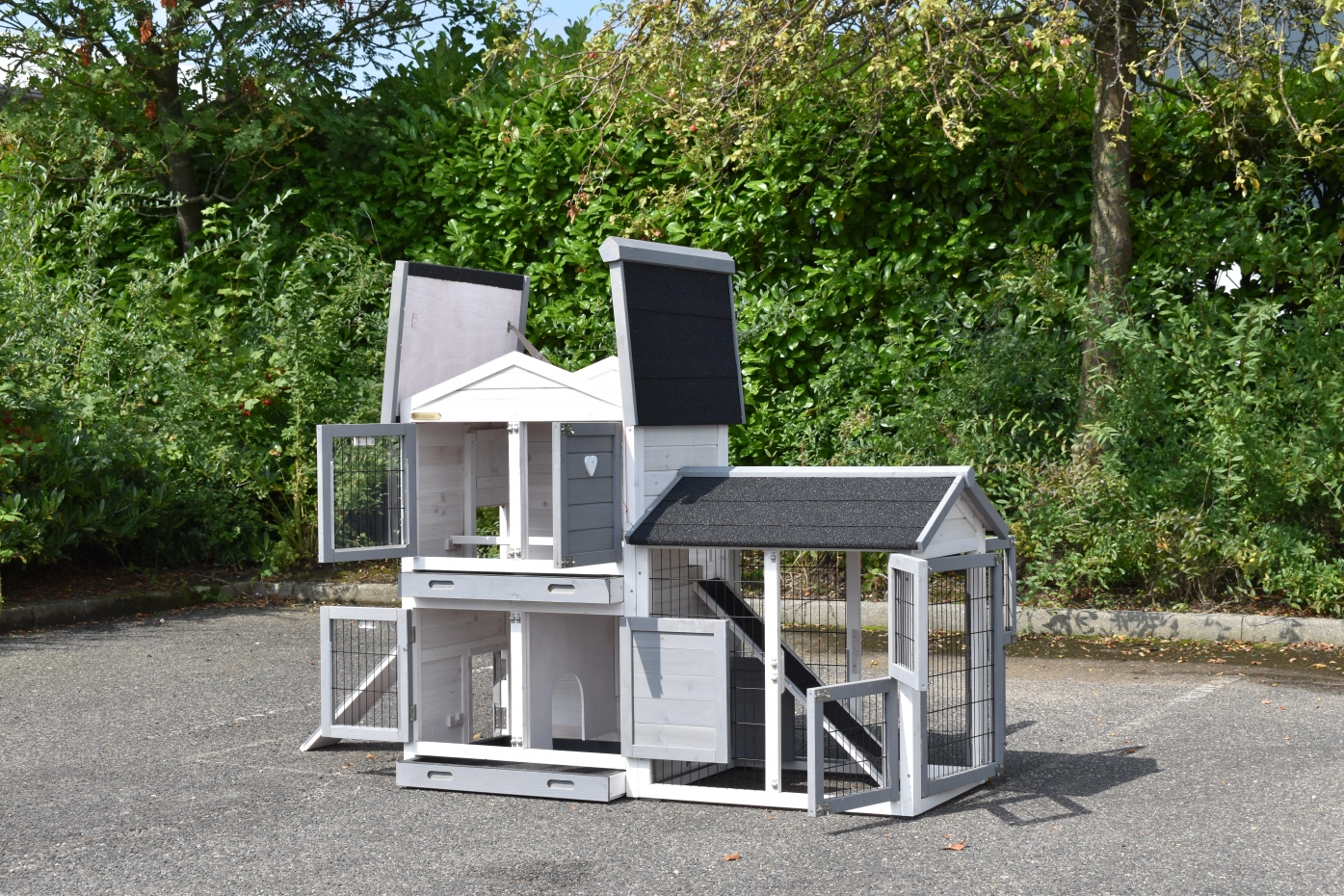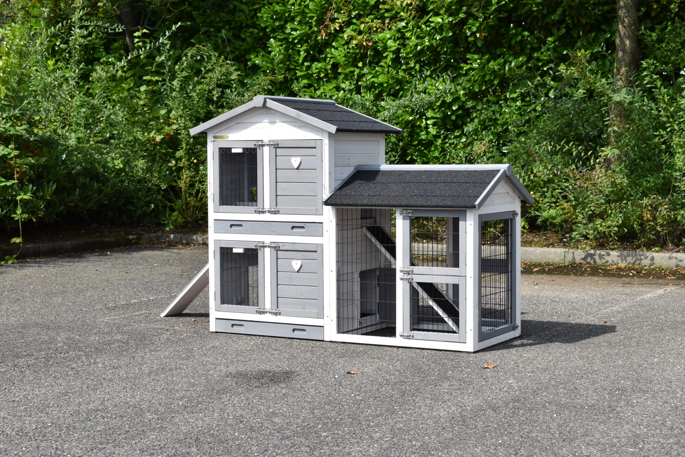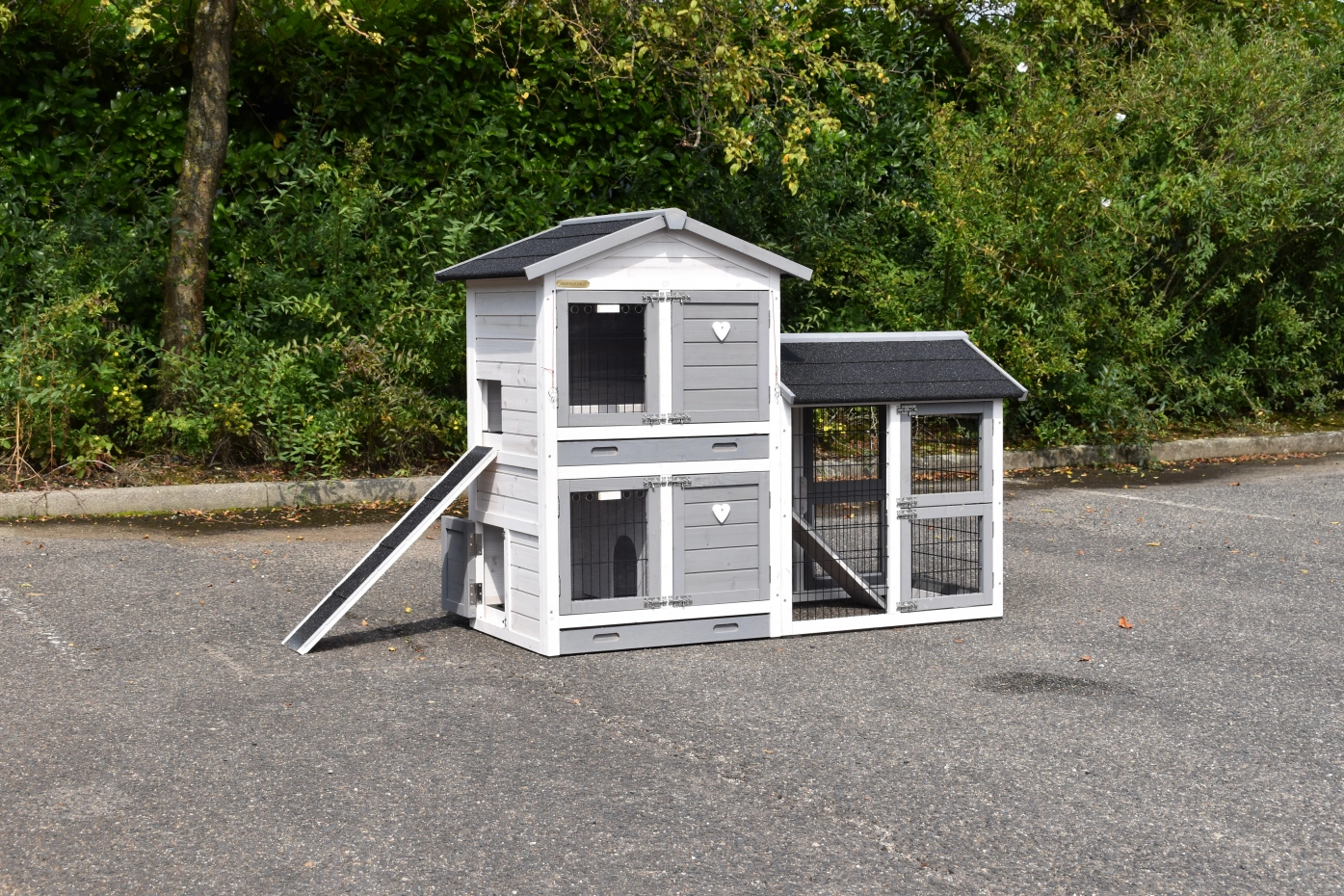 Clapier pour lapin Double Small avec enclos est un magnifique clapier avec de grandes portes anti-rongeurs. Ce clapier pratique dispose de 2 abris de nuit séparées et verrouillables. Avec ce clapier, vous pouvez décider si vos lapins peuvent rester ensemble ou non. 2 panneaux en plexiglas sont inclus pour les portes des abris de nuit.