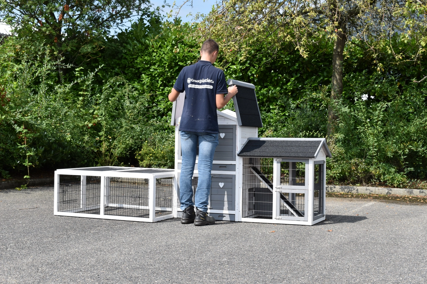 - Pour combiner enclos et poulailler, un panneau de treillis et / ou une porte doit être enlevé