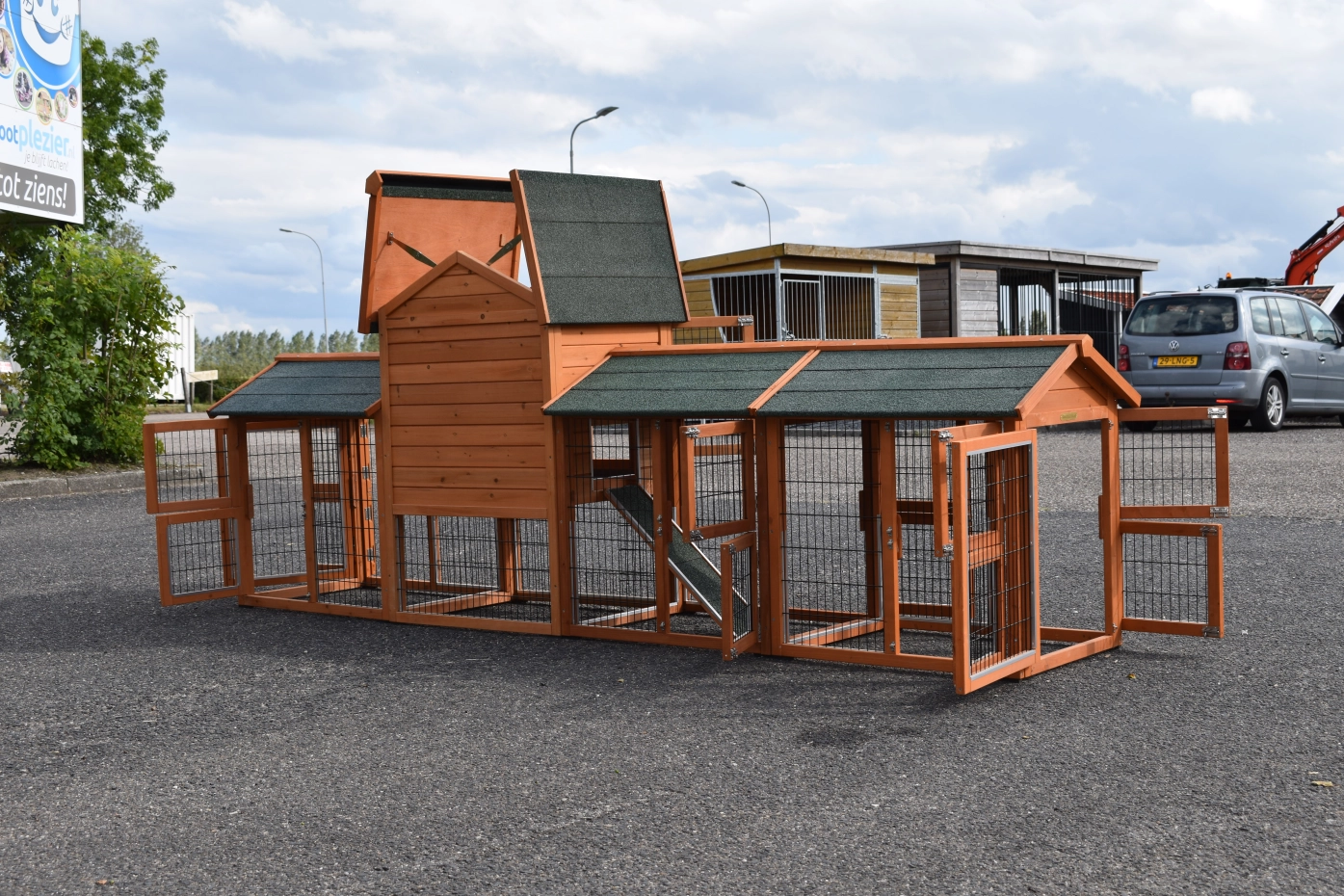 - Pour combiner enclos et poulailler, un panneau de treillis et / ou une porte doit être enlevé