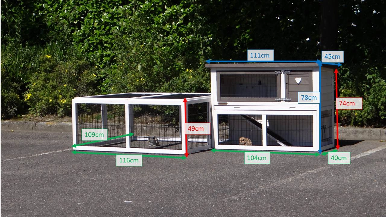 | Dimensions du sol extérieur (LxP) | nichoir 104x40 cm, enclos 109x116 cm |