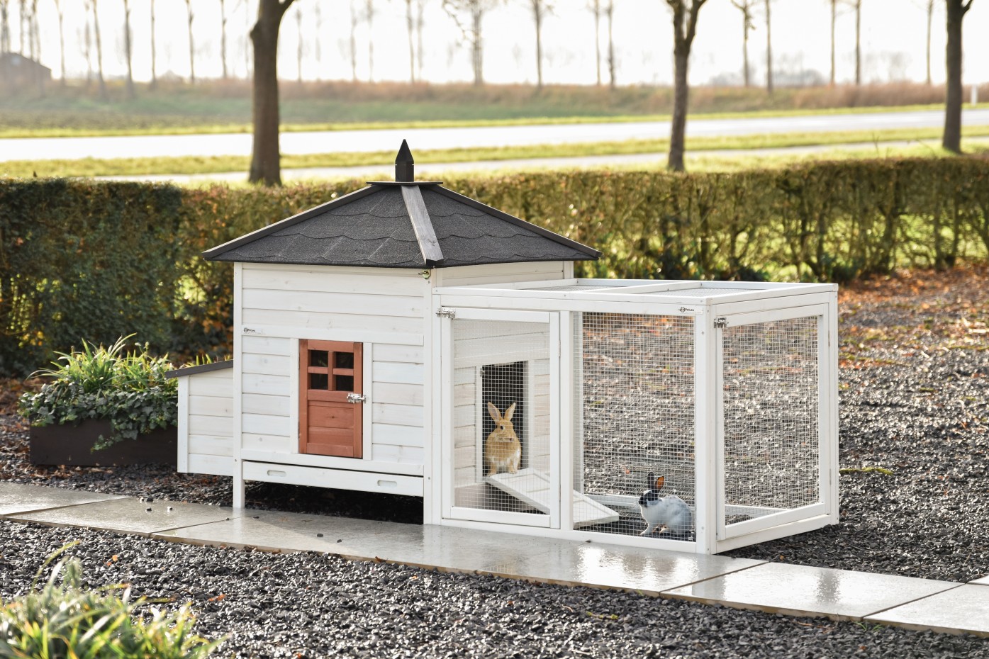 Le clapier est en fait un poulailler, mais convient aux gros lapins, aussi. S'il vous plaît noter; le clapier n'est pas équipée avec bandes de protection pour Anti-Rongement. Vous pouvez les acheter séparé. Le clapier est approprié pour 2 à 4 lapins. Les dimensions maximal, incl. toit, ont 218x93x122cm .