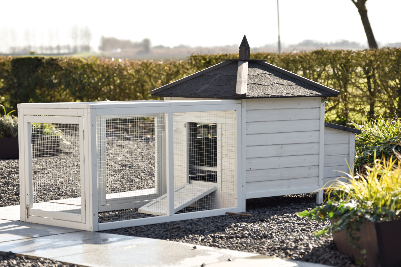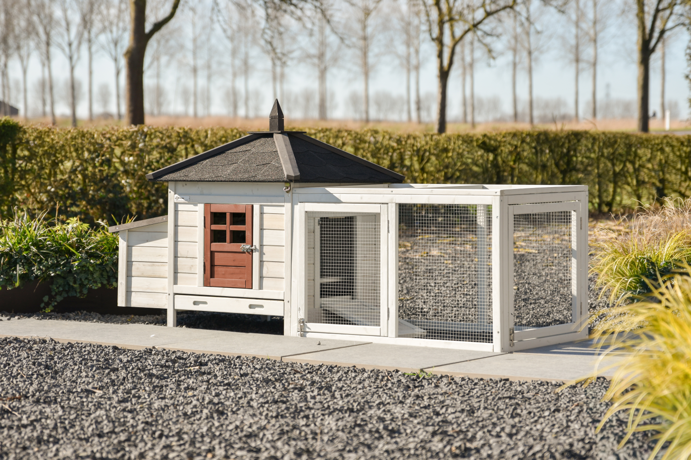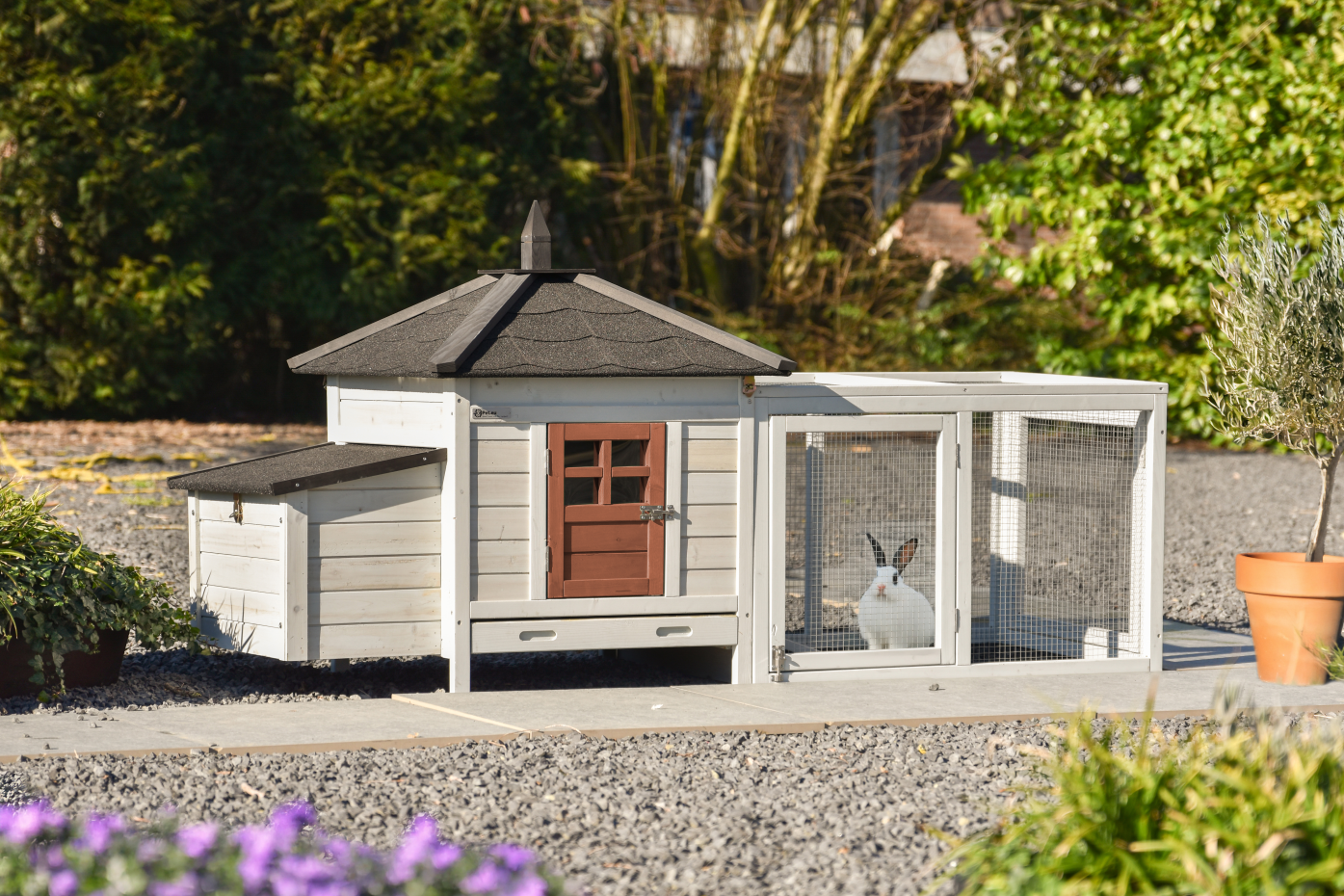 Le clapier Ambiance Small avec enclos est un véritable point de mire dans le jardin et combine une belle apparence avec un usage pratique. Le clapier est équipé d’un tiroir coulissant en plastique, ce qui facilite le nettoyage. Il possède également un toit entièrement amovible pour un accès supplémentaire et une porte latérale qui sert aussi de rampe. L’enclos est équipé d’un toit en grillage