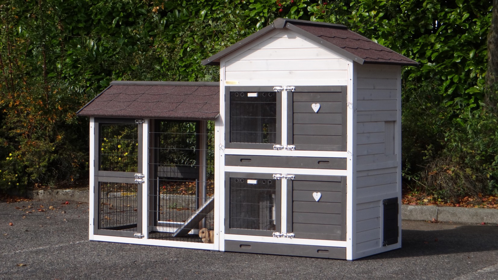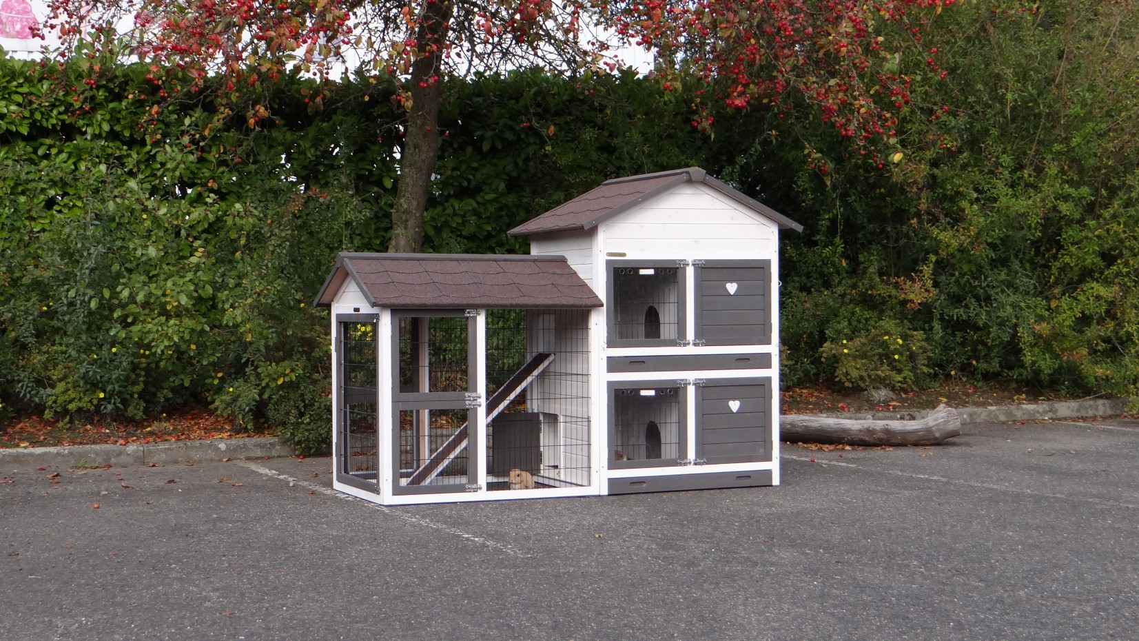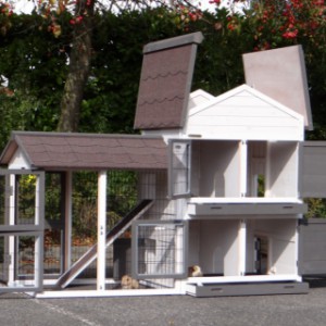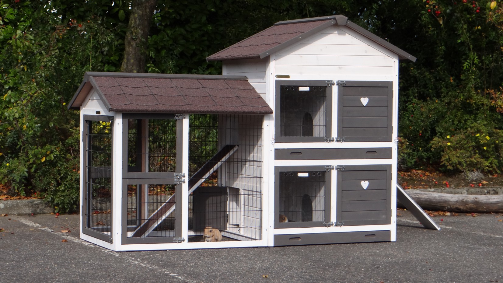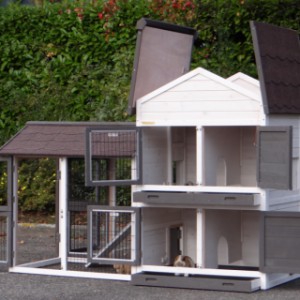 Le bois utilisé pour le loft est un produit naturel unique qu'a été produit dans le pays d'origine, après une sélection rigoureuse, dans une manière traditionelle. C'est caractéristique et unique à tous égards. Ce produit en bois a été un traitement manuel. Aucune pièce de bois ne possède la même forme, la même structure ou la même couleur, de sorte que les nuances de couleur sont inévitables, même dans un morceau de bois. Les fissures dues au vent, les craquelures, les imperfections et la présence de gros et de petits noeuds témoignent de leur origine et de leurs années de croissance. Les bosses sont généralement mises à jour manuellement avec du bois. Grâce à leur utilisation et à l’influence de la lumière, les nouveaux maisons pour animaux auront une couleur plus chaude au fil du temps. Les différences de couleur au modèle d'exposition sont donc possibles. L'enclos pour animaux est munie d'un fini antitache dans les couleurs comme sur la photo. Vous devez encore décaper le bois pour éviter les moisissures et la pourriture. Vous pouvez facilement commander des taches directement.