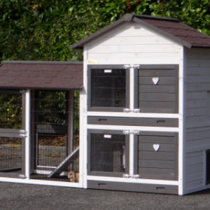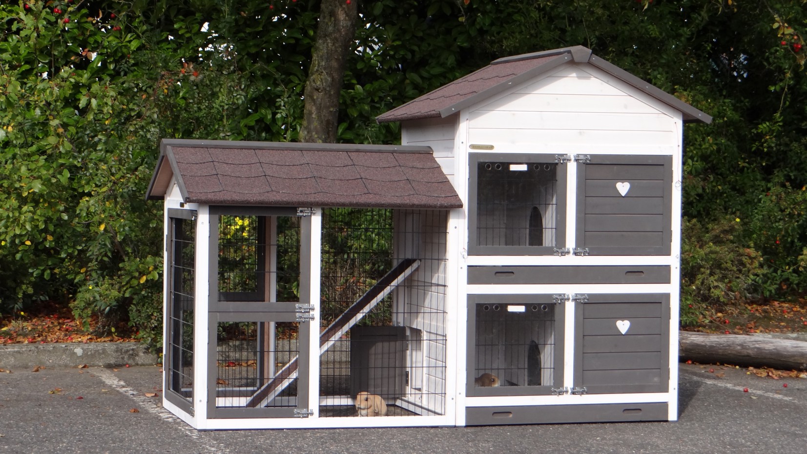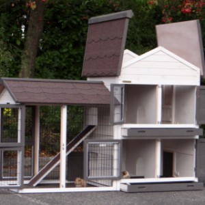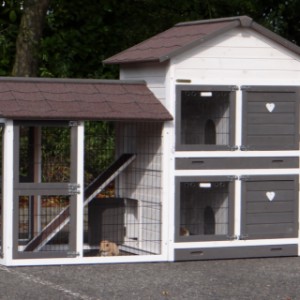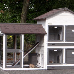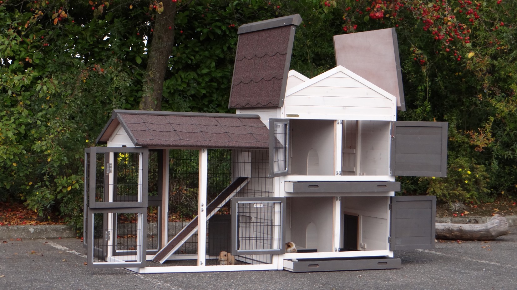 Le bois utilisé pour le loft est un produit naturel unique qu'a été produit dans le pays d'origine, après une sélection rigoureuse, dans une manière traditionelle. C'est caractéristique et unique à tous égards. Ce produit en bois a été un traitement manuel. Aucune pièce de bois ne possède la même forme, la même structure ou la même couleur, de sorte que les nuances de couleur sont inévitables, même dans un morceau de bois. Les fissures dues au vent, les craquelures, les imperfections et la présence de gros et de petits noeuds témoignent de leur origine et de leurs années de croissance. Les bosses sont généralement mises à jour manuellement avec du bois. Grâce à leur utilisation et à l’influence de la lumière, les nouveaux maisons pour animaux auront une couleur plus chaude au fil du temps. Les différences de couleur au modèle d'exposition sont donc possibles. L'enclos pour animaux est munie d'un fini antitache dans les couleurs comme sur la photo. Vous devez encore décaper le bois pour éviter les moisissures et la pourriture. Vous pouvez facilement commander des taches directement.