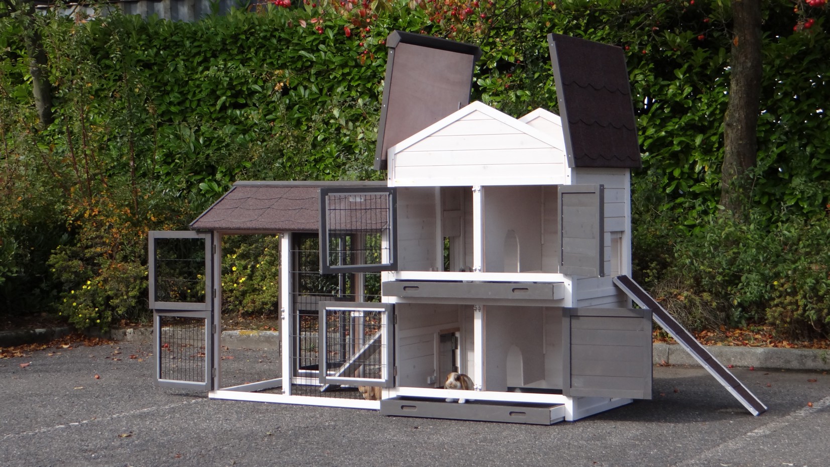 Il est conseillé de traiter périodiquement les charnières et les serrures avec un spray en silicone ou un spray pour serrures pour éviter la rouille et la corrosion. Si l'animal n'est pas dans un endroit abrité, nous vous conseillons d'ancrer l'enclos.