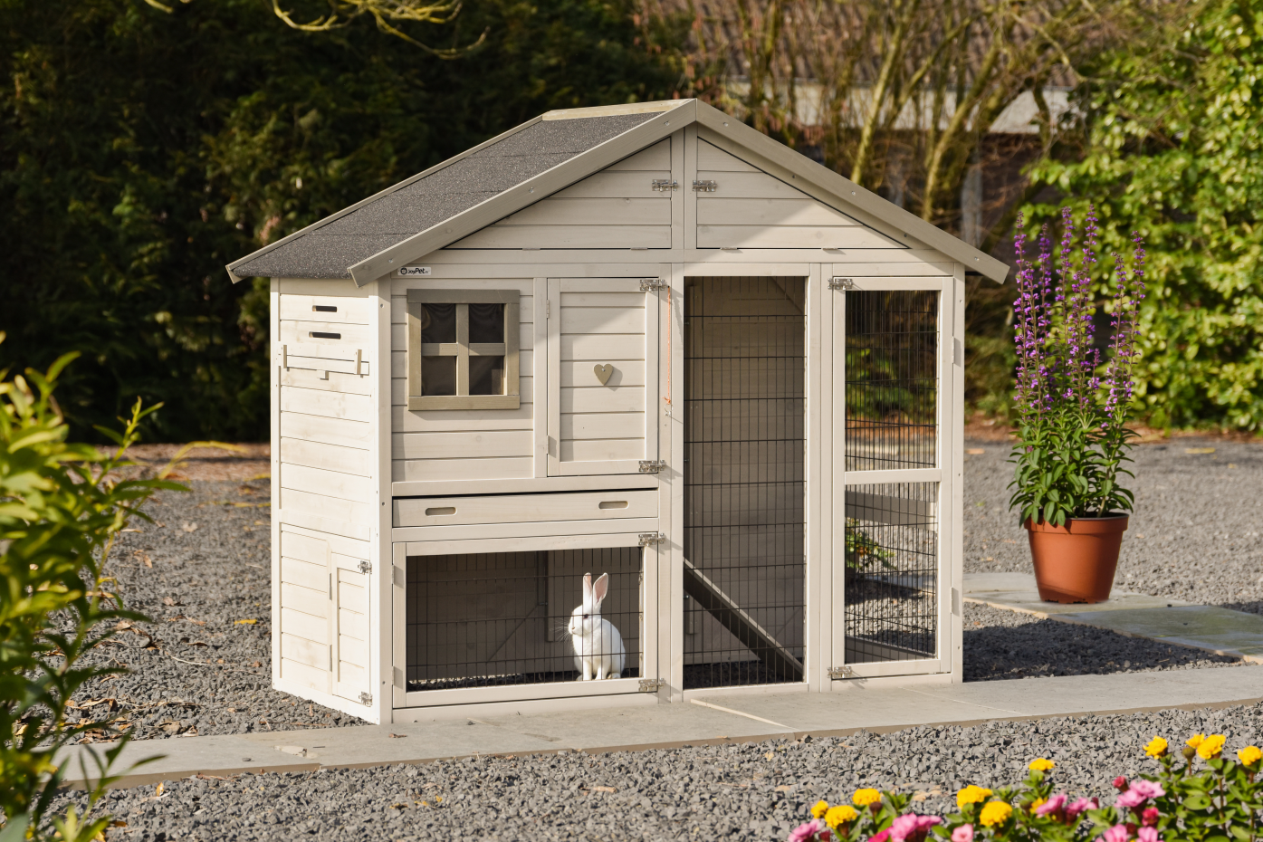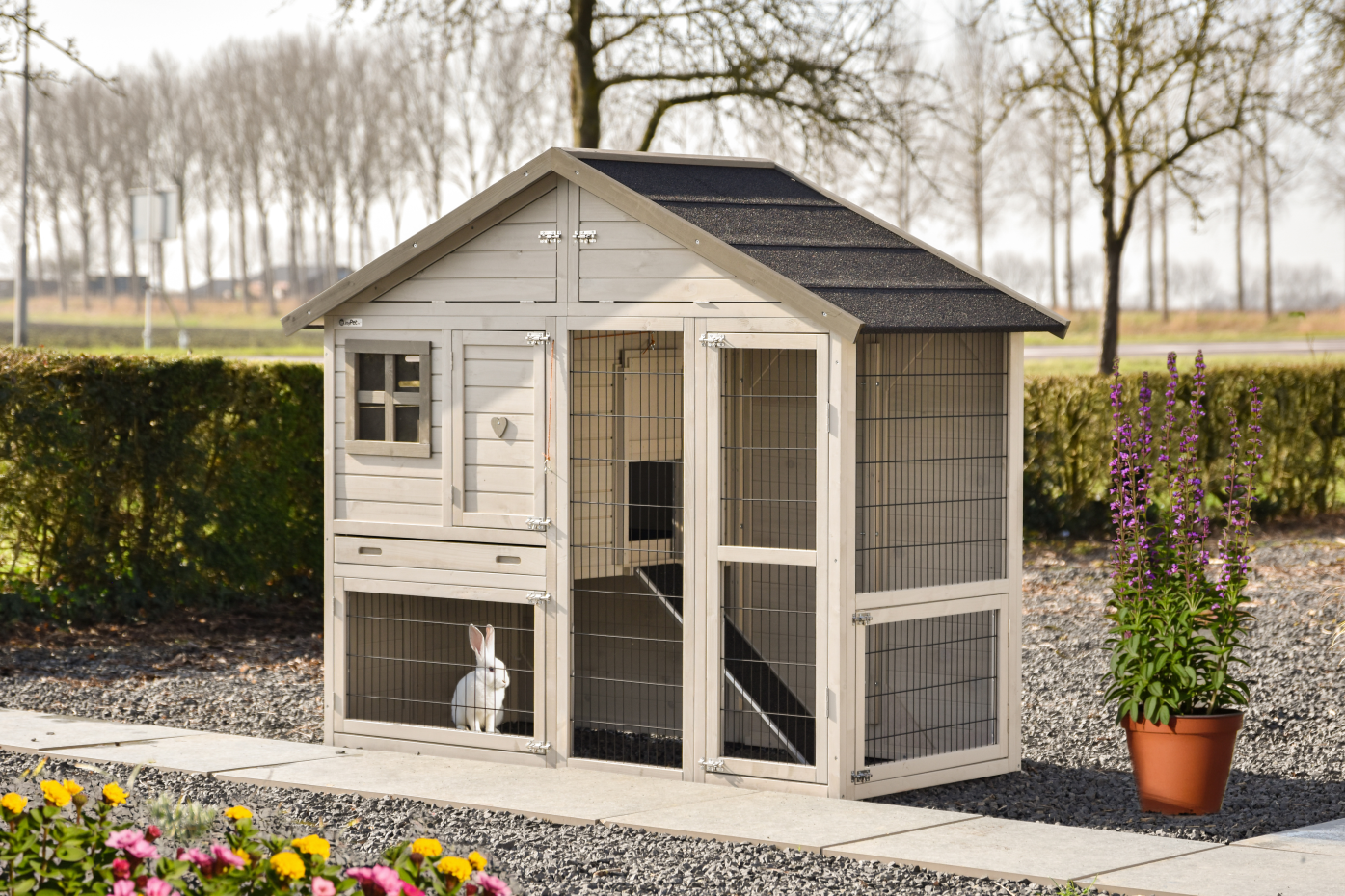 Le clapier Holiday medium est un abri spacieux et pratique en couleur light-grey avec plusieurs portes, ce qui facilite l’alimentation, le nettoyage et les soins quotidiens ; ce modèle de taille moyenne de la série Holiday offre un espace de vie confortable aux lapins, dispose d’un grenier de rangement pratique pour l’alimentation ou les accessoires et peut être complété par différents enclos extérieurs afin de s’adapter à l’espace disponible dans le jardin.