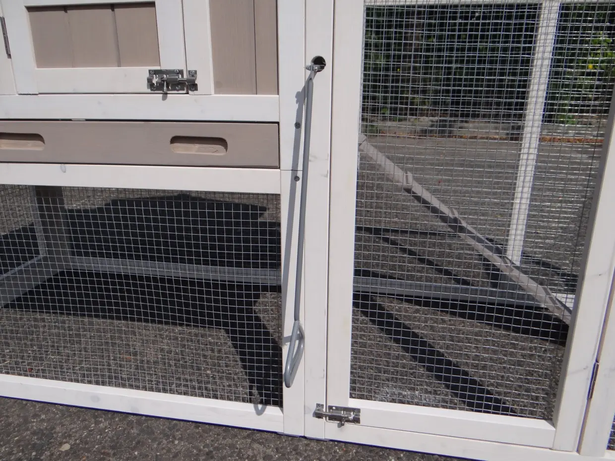Il est conseillé de traiter périodiquement les charnières et les serrures avec un spray en silicone ou un spray pour serrures pour éviter la rouille et la corrosion. Si l'animal n'est pas dans un endroit abrité, nous vous conseillons d'ancrer l'enclos.