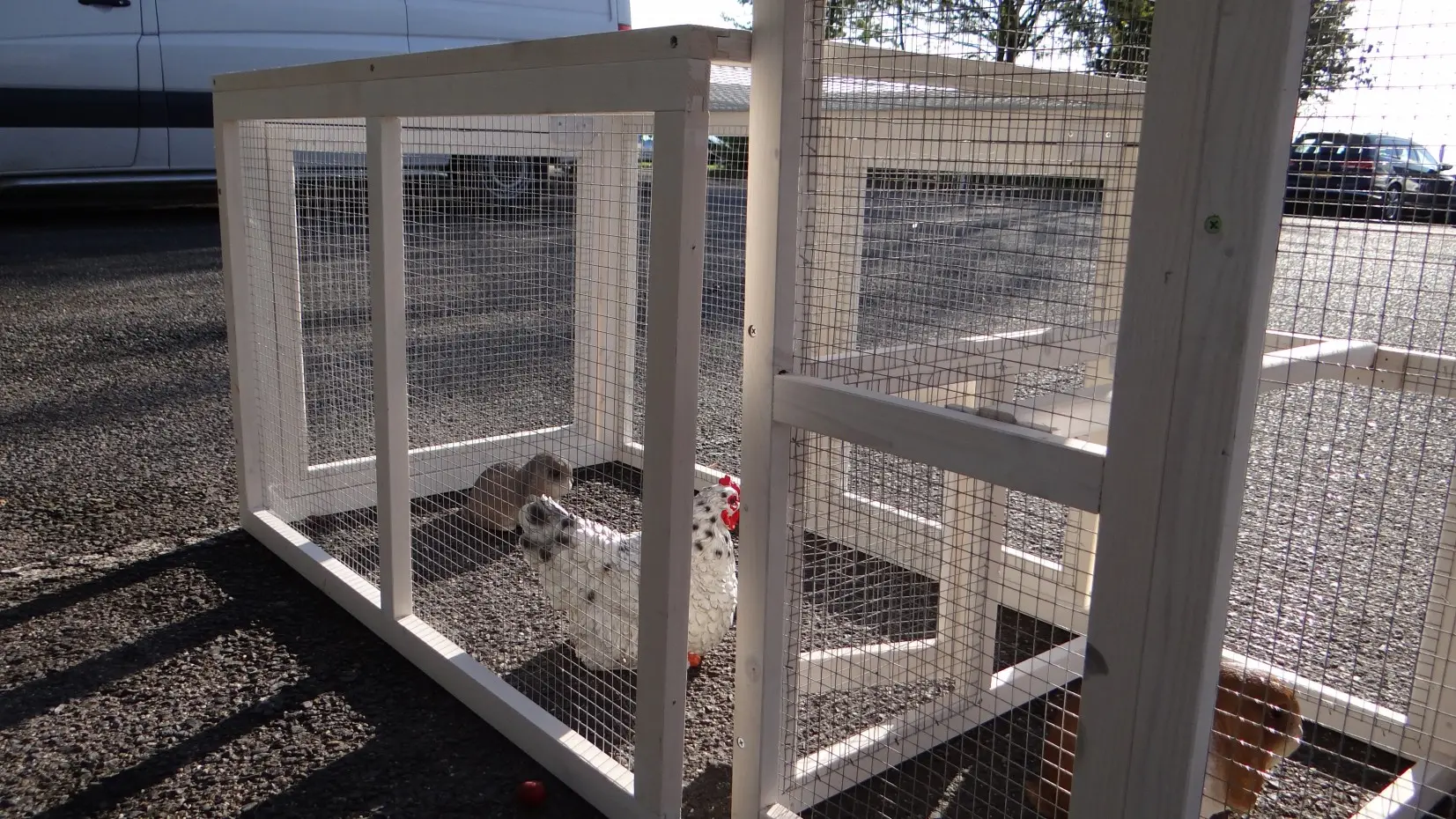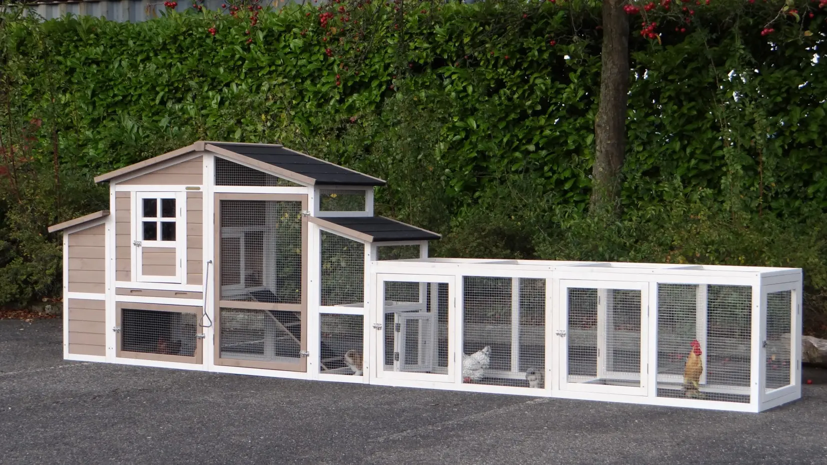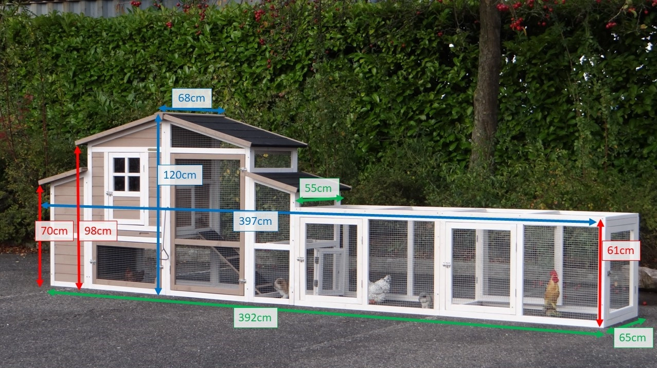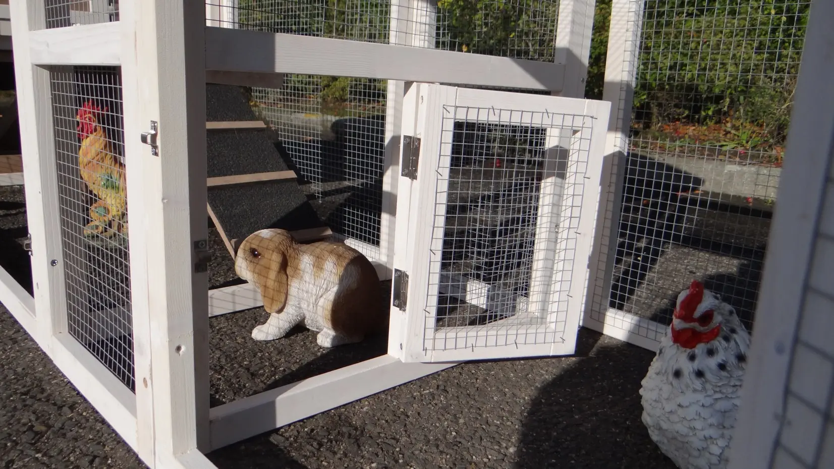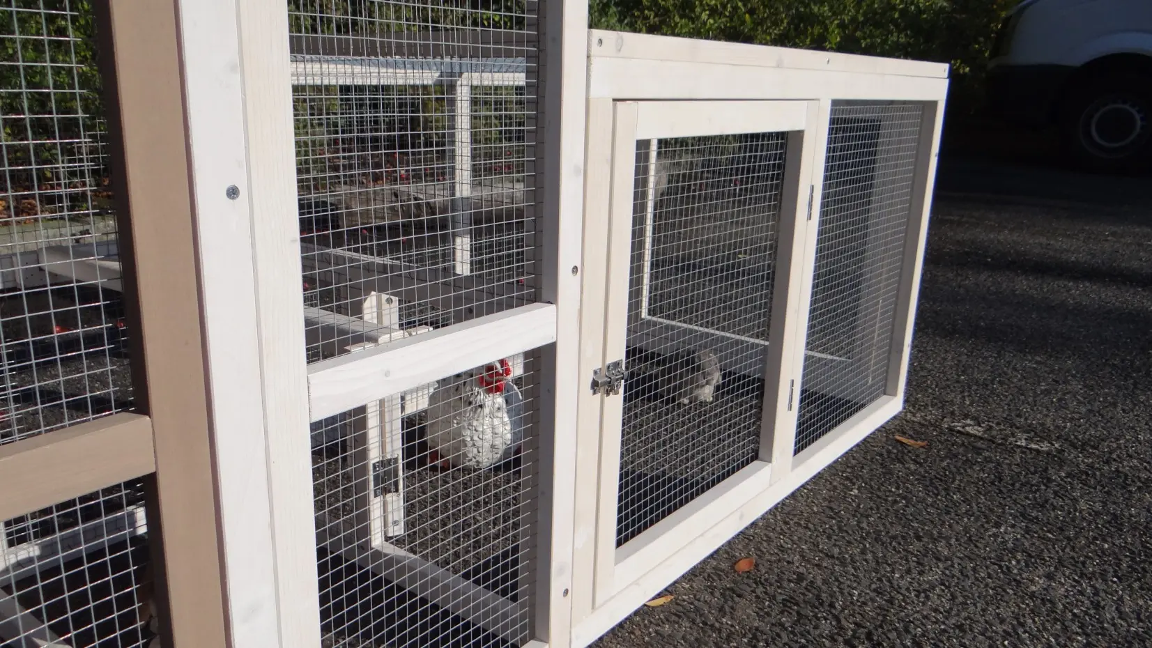 - Pour combiner enclos et poulailler, un panneau de treillis et / ou une porte doit être enlevé