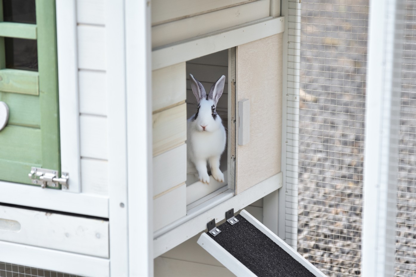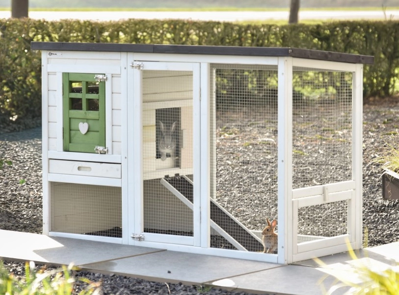 Le clapier Noah est un abri très avantageux et esthétique avec un abri de nuit et un enclos. Le clapier Noah est équipé de portes spacieuses et d’un tiroir à déjections coulissant pratique dans l’abri de nuit. Noah est un très joli petit clapier pour 2 petits lapins. Les dimensions maximales, toit compris, sont de 136x64x87cm.