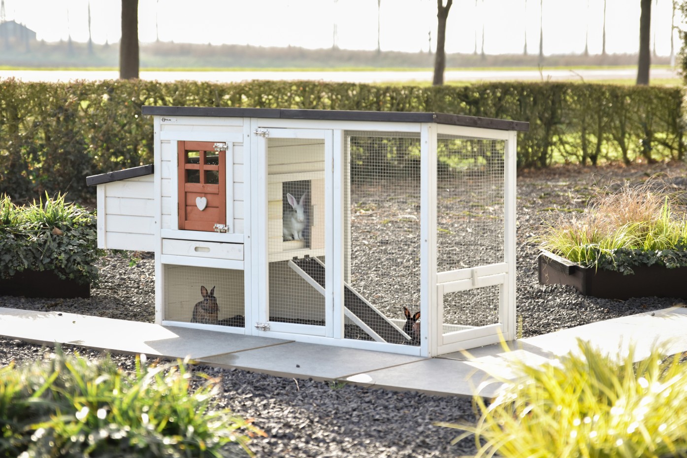 Le clapier Noah est un clapier très abordable et magnifique avec un espace de nid, un abri de nuit et un enclos. Le clapier Noah est équipé de portes spacieuses et d'un tiroir à fumier extensible pratique dans l'abri de nuit. Noah est un très joli petit clapier pour 2 petits lapins. Les dimensions maximal, incl. toit et pondoir, ont 168x65x87cm.