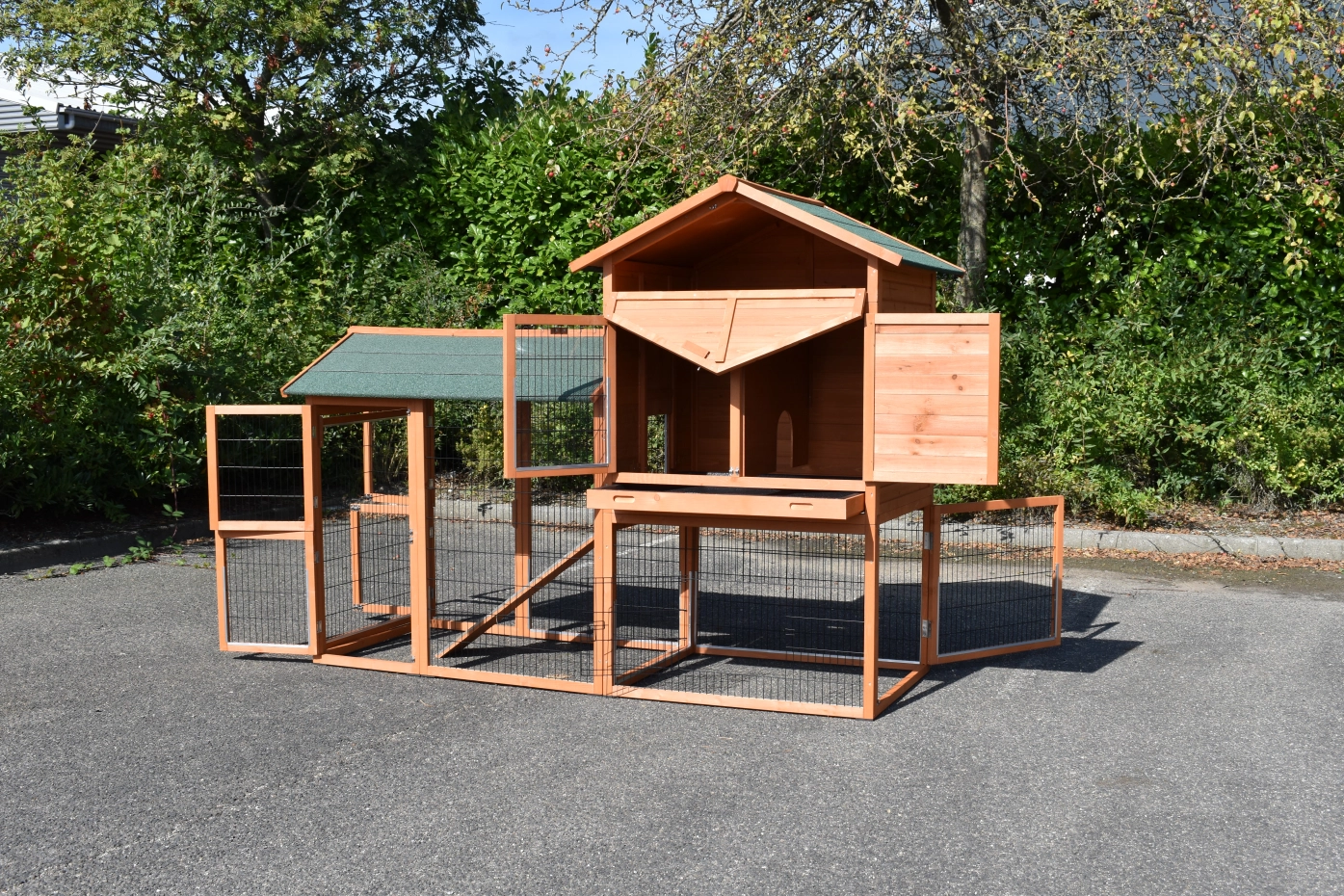 Le clapier pour lapin Prestige Large est équipée avec un enclos à gauche. L'abri de nuit est approprié pour 2 à 4 lapins. L'abri de nuit a grande portes et une tiroir, pour un nettoyage facile.