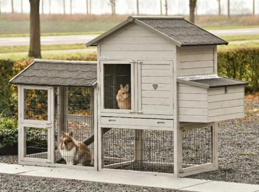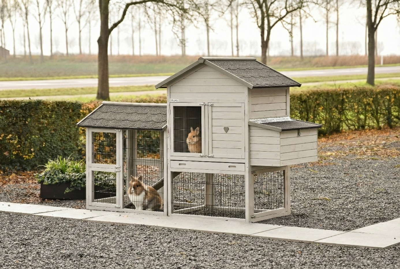 Le clapier pour lapin Prestige Medium avec enclos à gauche et une pondoir est équipée avec bandes d'aluminium. Le clapier est approprié pour 1 à 3 lapins. Le clapier a grande portes, un grand abri de nuit et un grand enclos. Le clapier a pieds en caoutchouc. Ce clapier à lapins peut également être installé dans l'autre sens avec un petit ajustement.