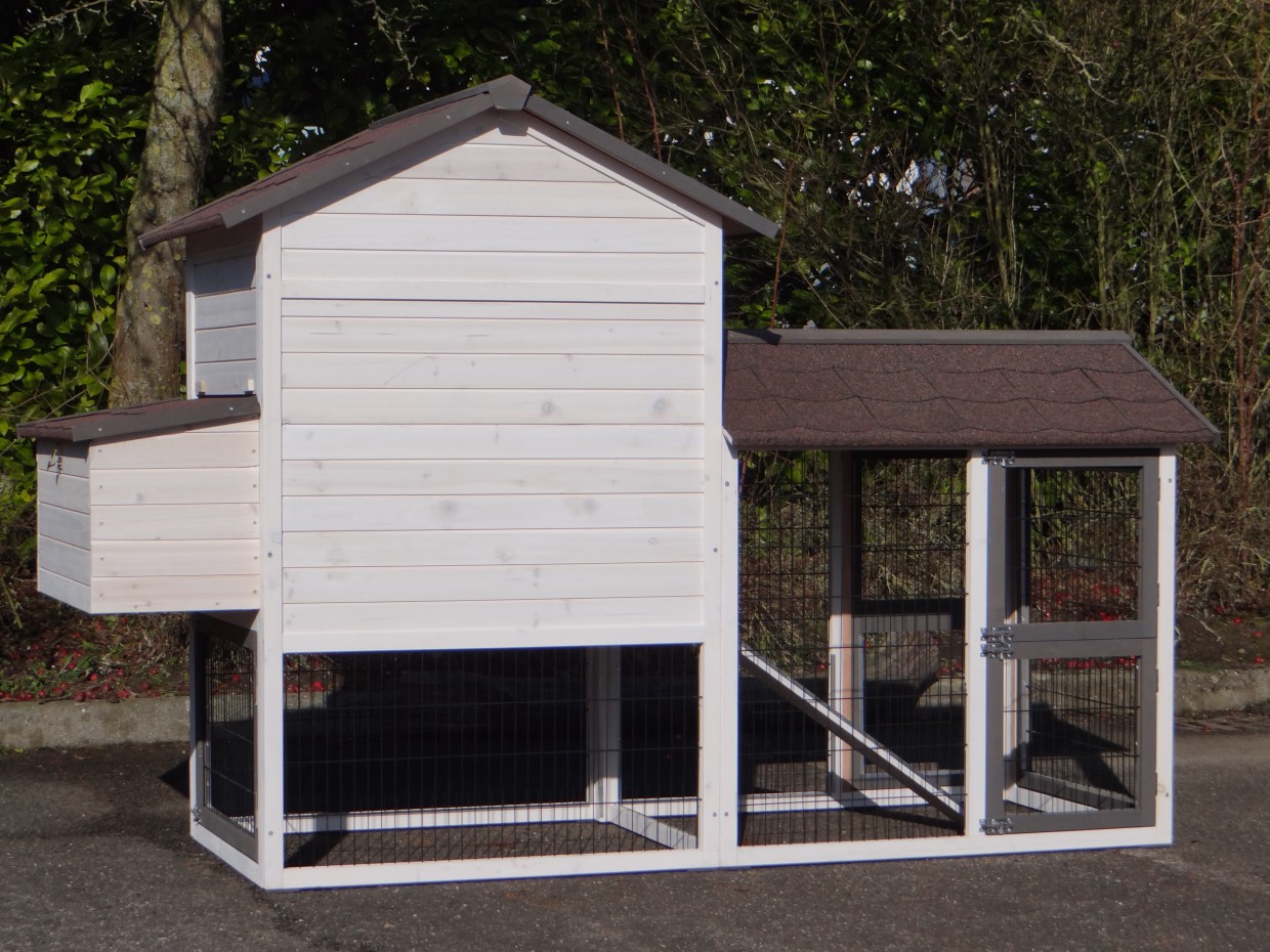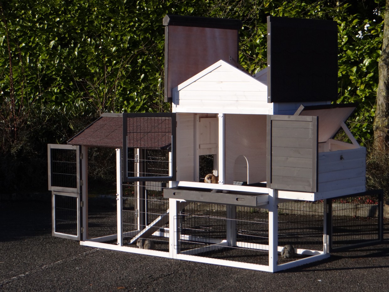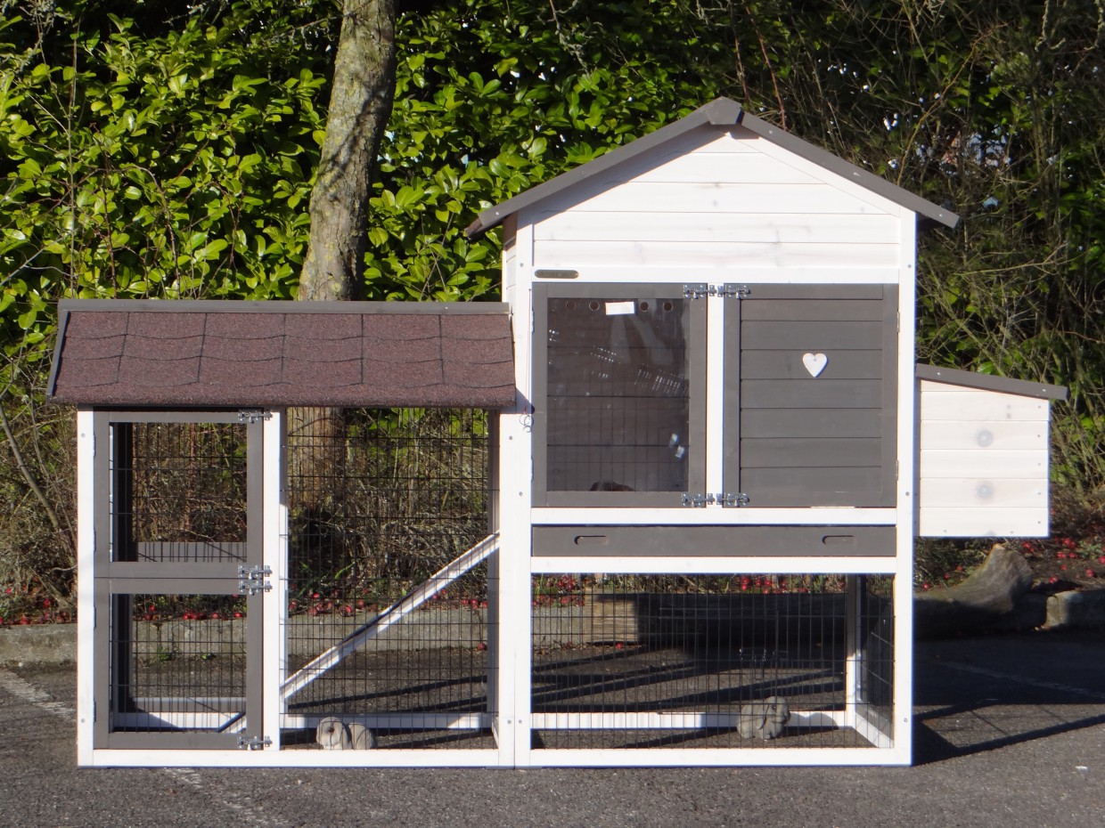 Le bois utilisé pour le loft est un produit naturel unique qu'a été produit dans le pays d'origine, après une sélection rigoureuse, dans une manière traditionelle. C'est caractéristique et unique à tous égards. Ce produit en bois a été un traitement manuel. Aucune pièce de bois ne possède la même forme, la même structure ou la même couleur, de sorte que les nuances de couleur sont inévitables, même dans un morceau de bois. Les fissures dues au vent, les craquelures, les imperfections et la présence de gros et de petits noeuds témoignent de leur origine et de leurs années de croissance. Les bosses sont généralement mises à jour manuellement avec du bois. Grâce à leur utilisation et à l’influence de la lumière, les nouveaux maisons pour animaux auront une couleur plus chaude au fil du temps. Les différences de couleur au modèle d'exposition sont donc possibles. L'enclos pour animaux est munie d'un fini antitache dans les couleurs comme sur la photo. Vous devez encore décaper le bois pour éviter les moisissures et la pourriture. Vous pouvez facilement commander des taches directement.