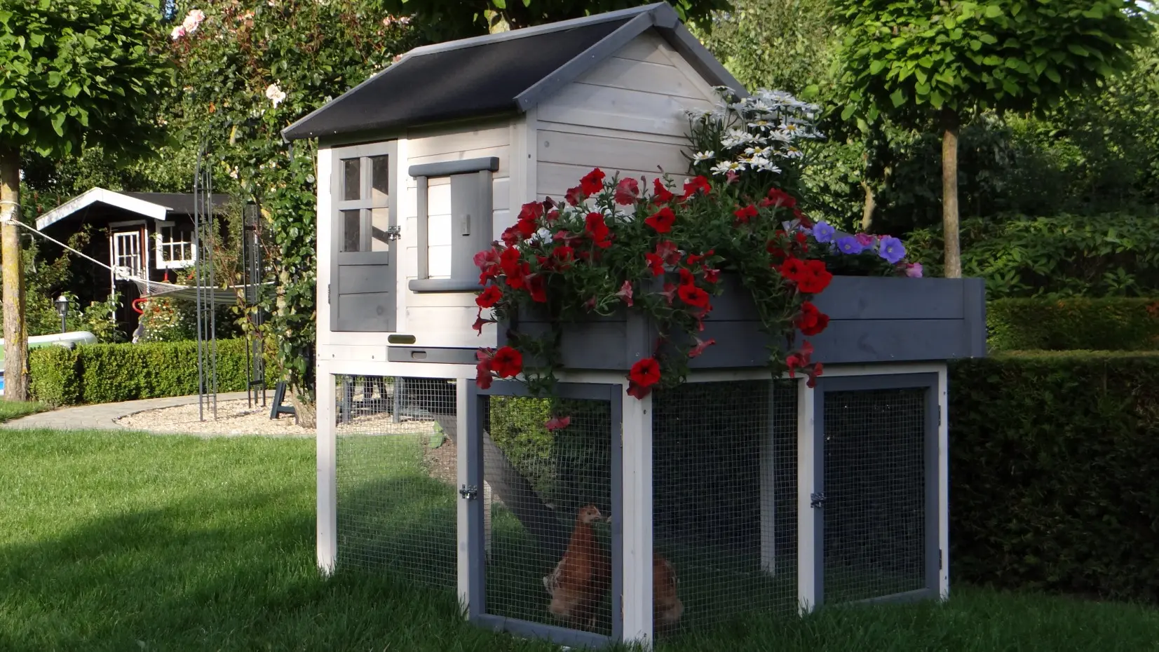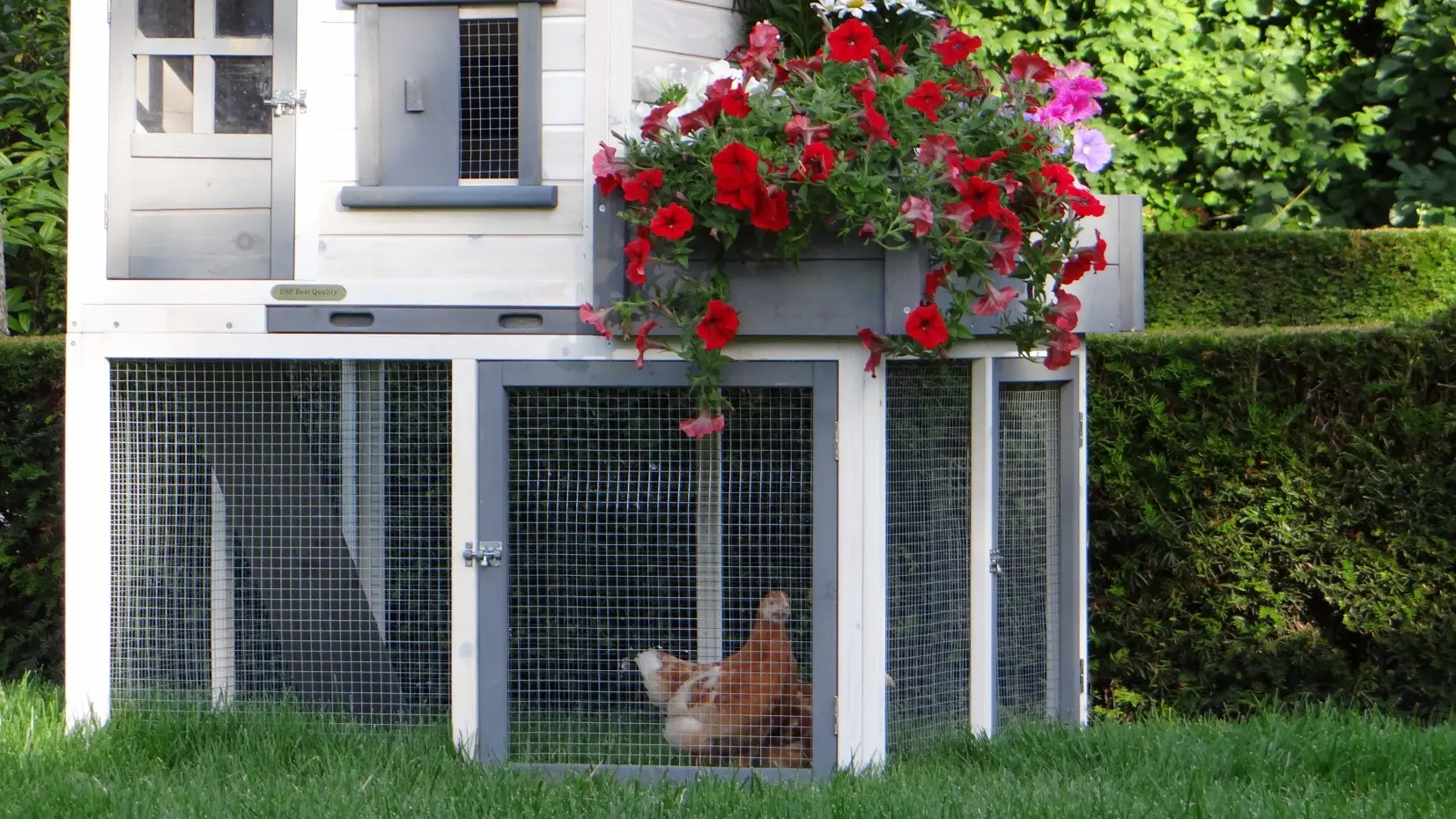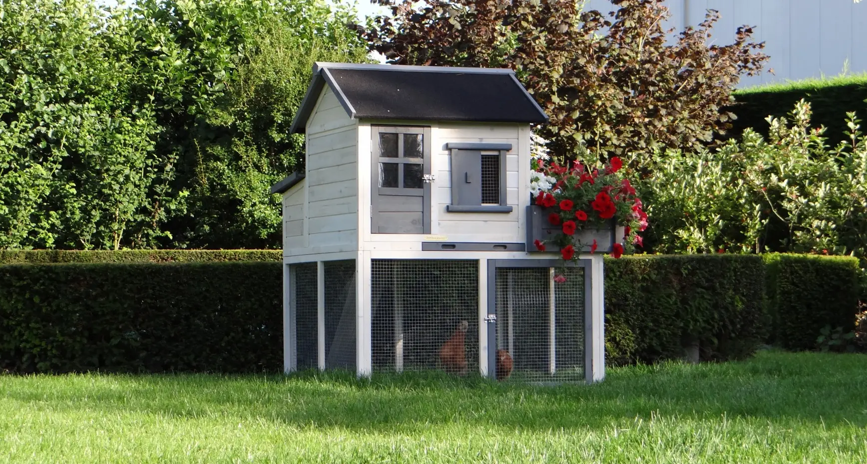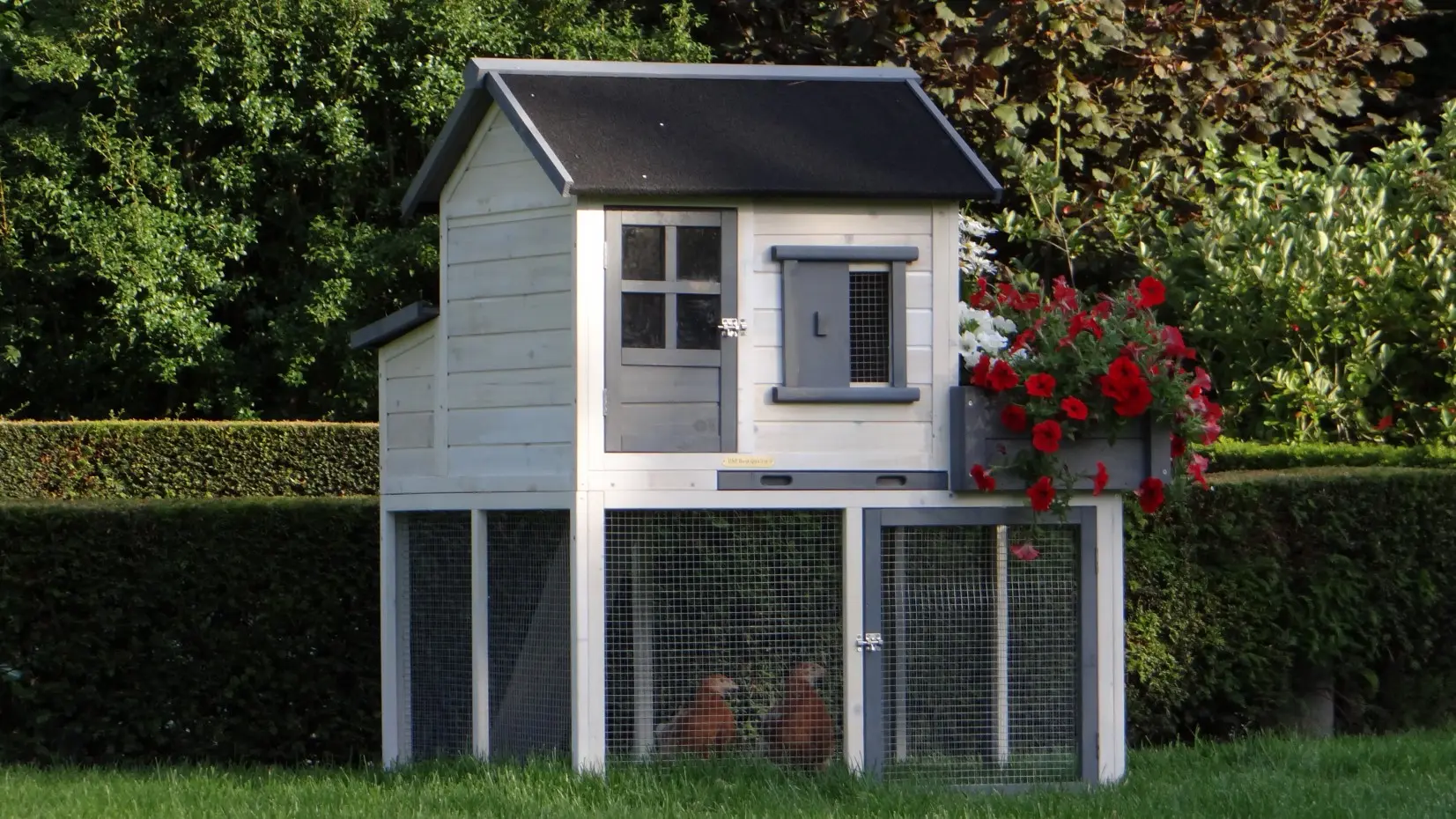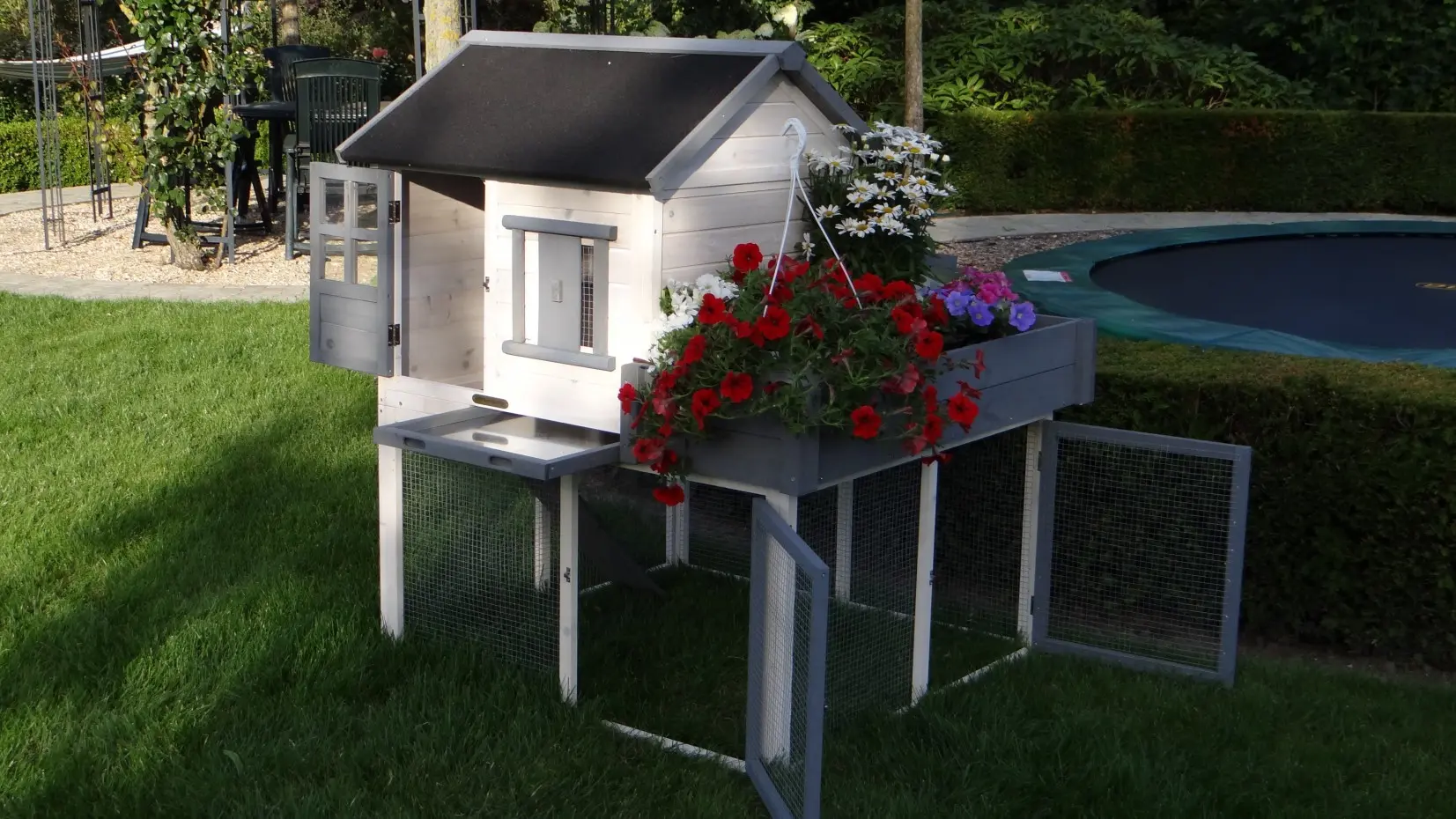 Le clapier pour lapin Sunshine est équipée avec un jardinière. A bel clapier avec un abri de nuit, un enclos et une tiroir amovible. Le clapier a un enclos à l'étage inférieure, avec un hauteur de 58cm. Les 2 étages sont connecté avec un rampe. Le toit du clapier est équipée avec toit bitumé noir. Approprié pour 2 lapins. Les dimensions maximal, inclus toit, sont 116x112x134cm.