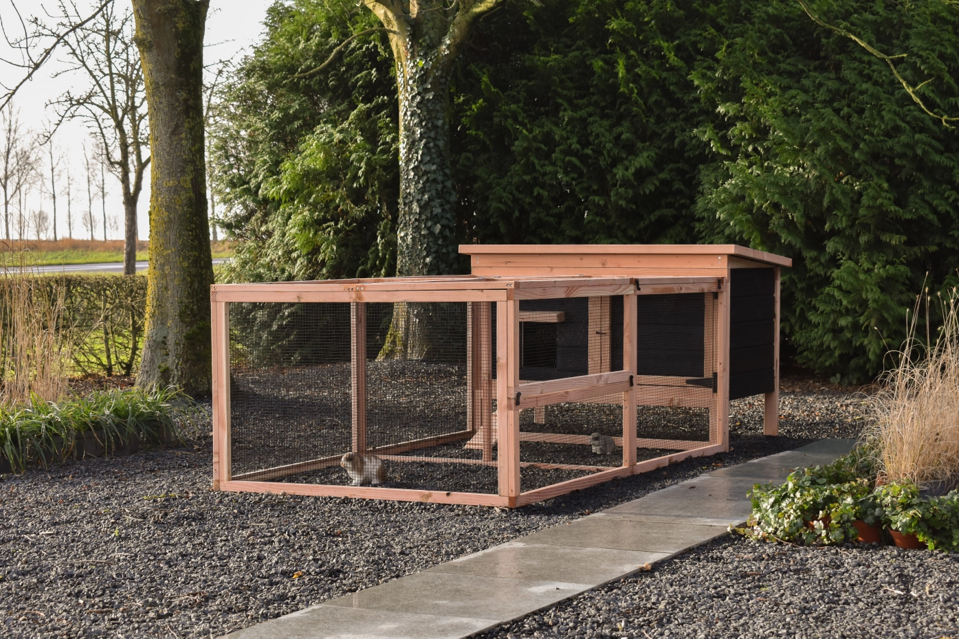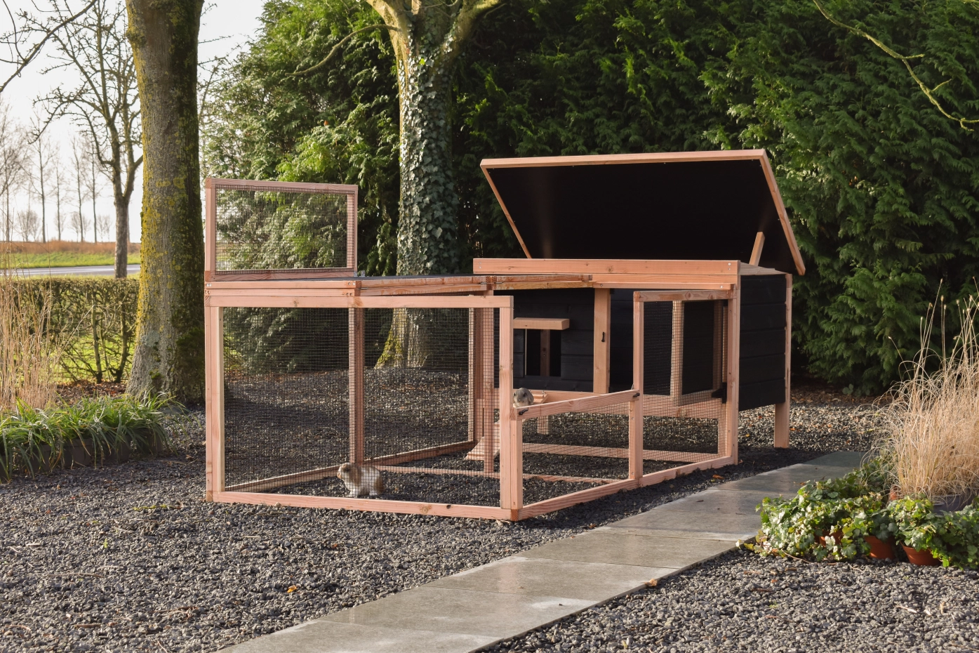 Ce modèle bas est facile à nettoyer grâce au toit rabattable et à la porte pratique à l'avant. La combinaison du bois de douglas noir donne au clapier un aspect chic.