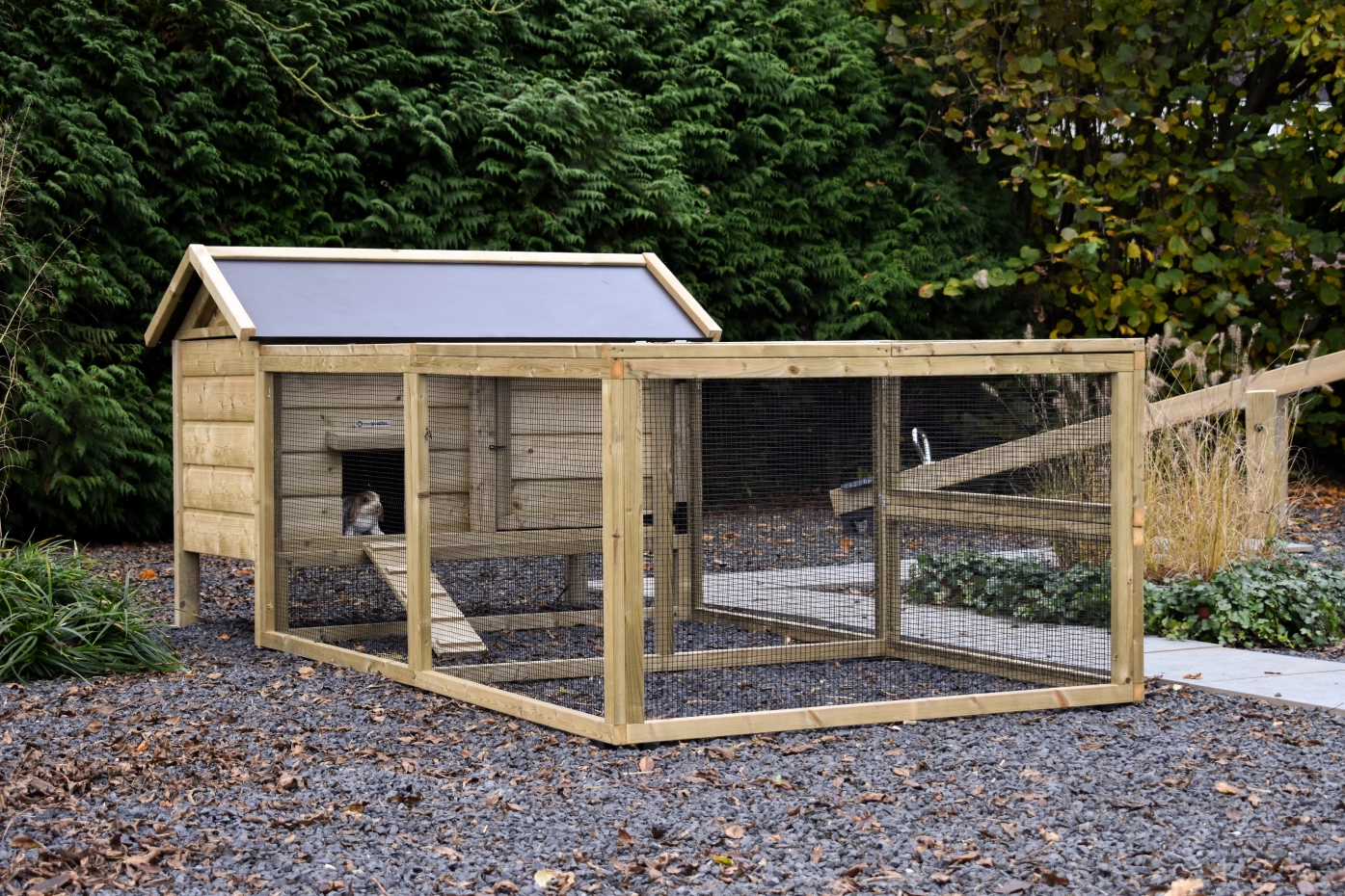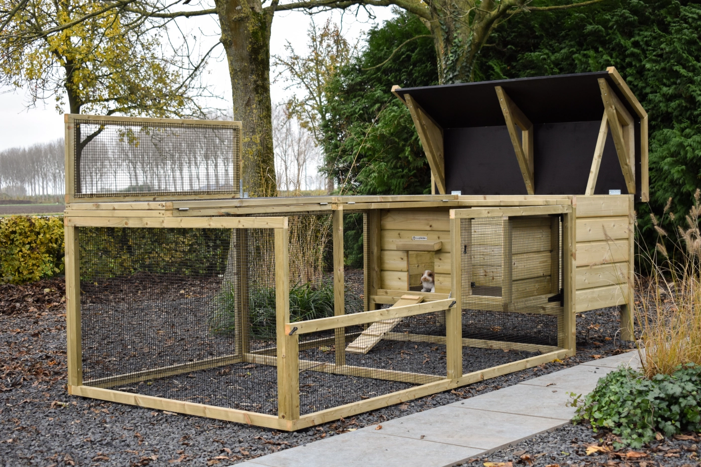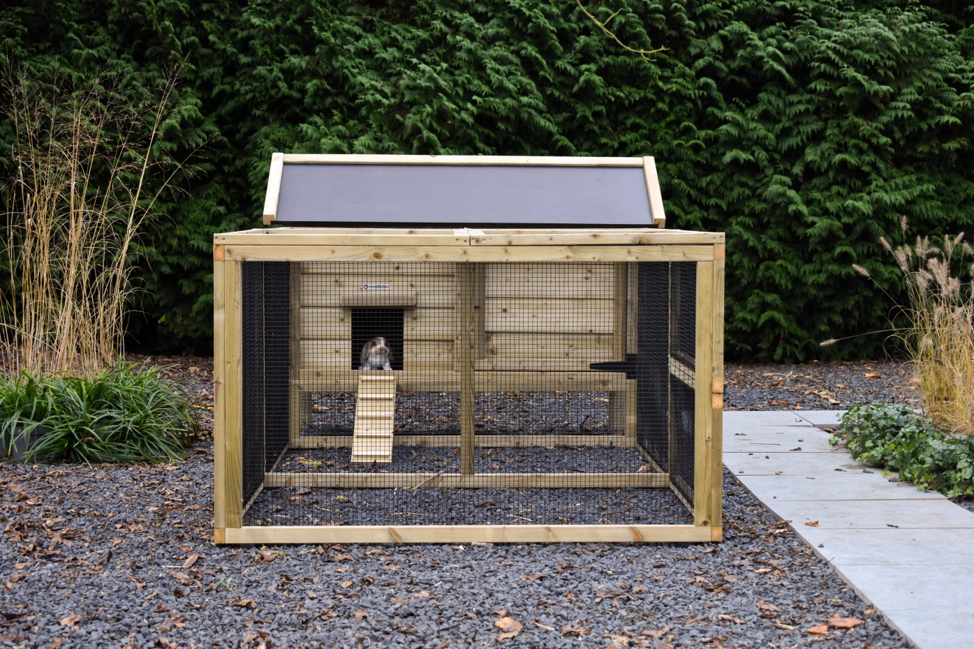 Ce modèle bas, avec un enclos spacieux, offre à vos lapins beaucoup d'espace pour gambader et rester actifs. Le clapier et l'enclos sont faciles à nettoyer grâce au toit articulé et à la porte pratique à l'avant.