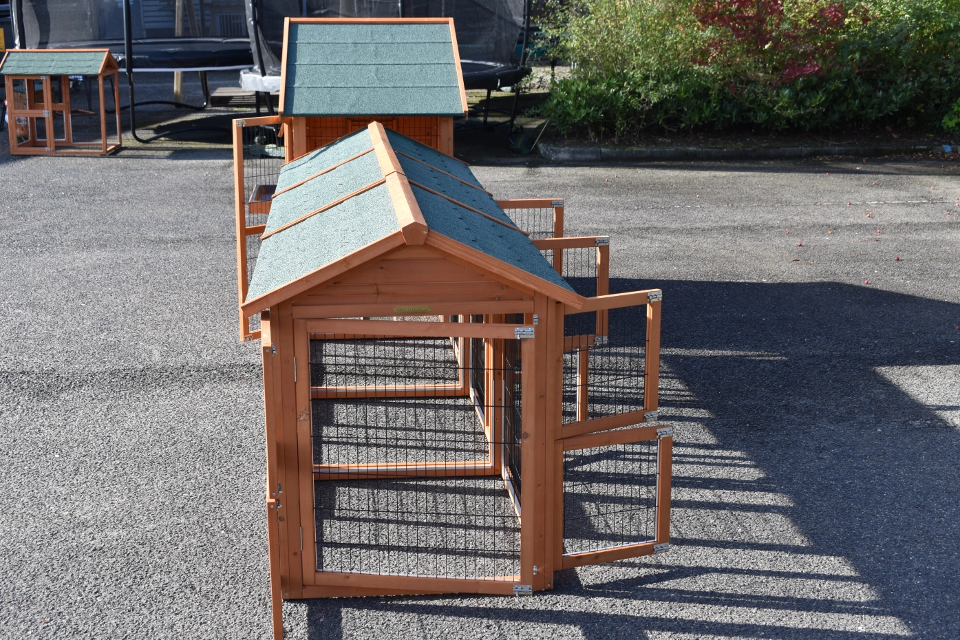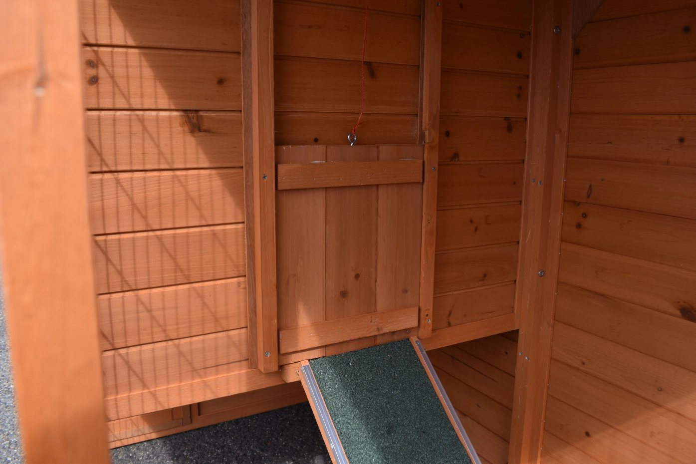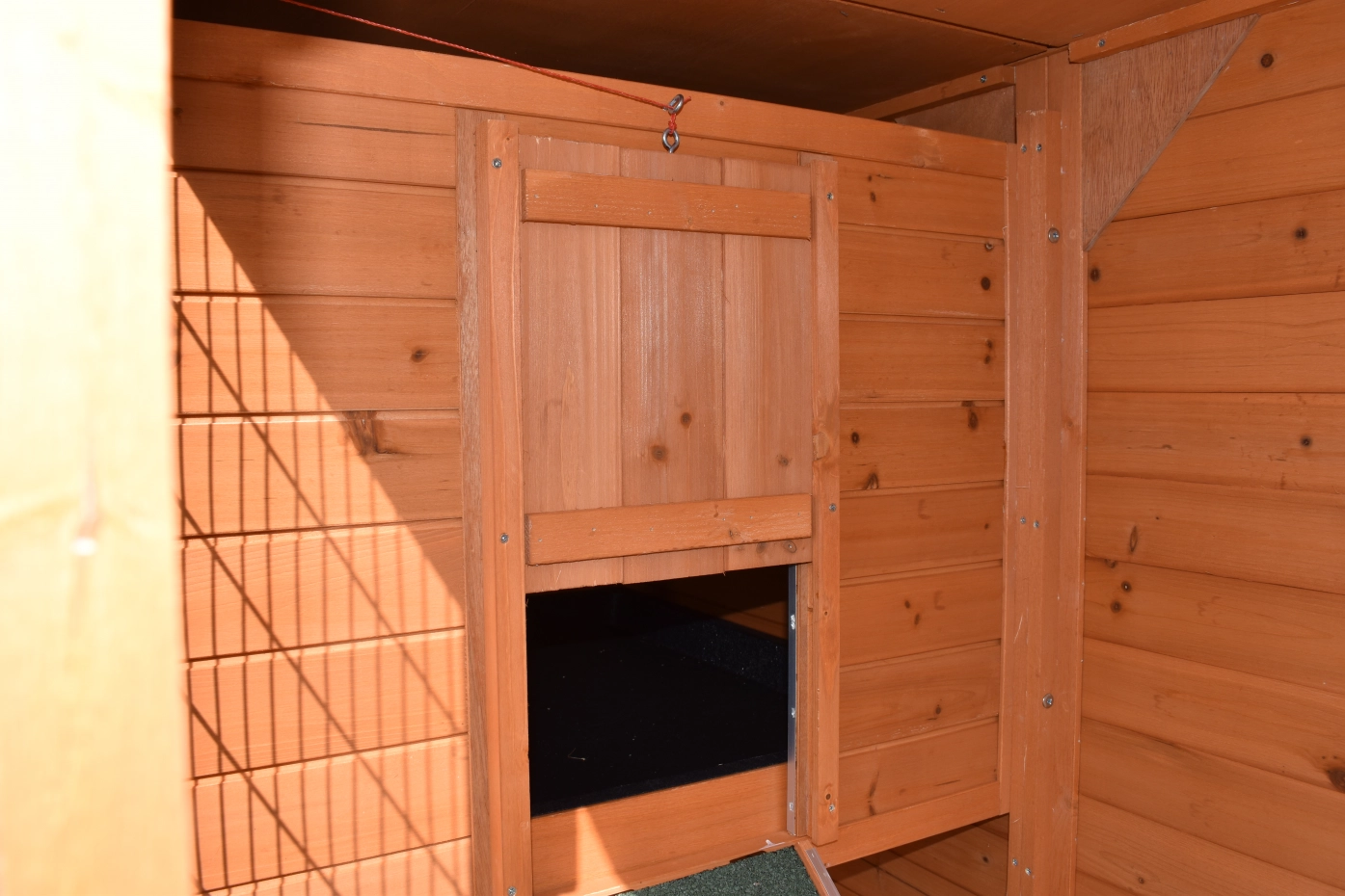- Pour combiner enclos et poulailler, un panneau de treillis et / ou une porte doit être enlevé