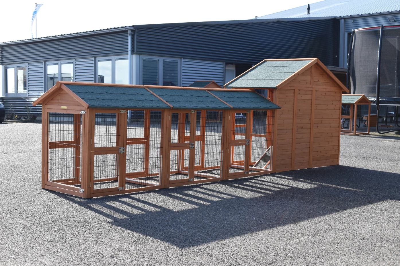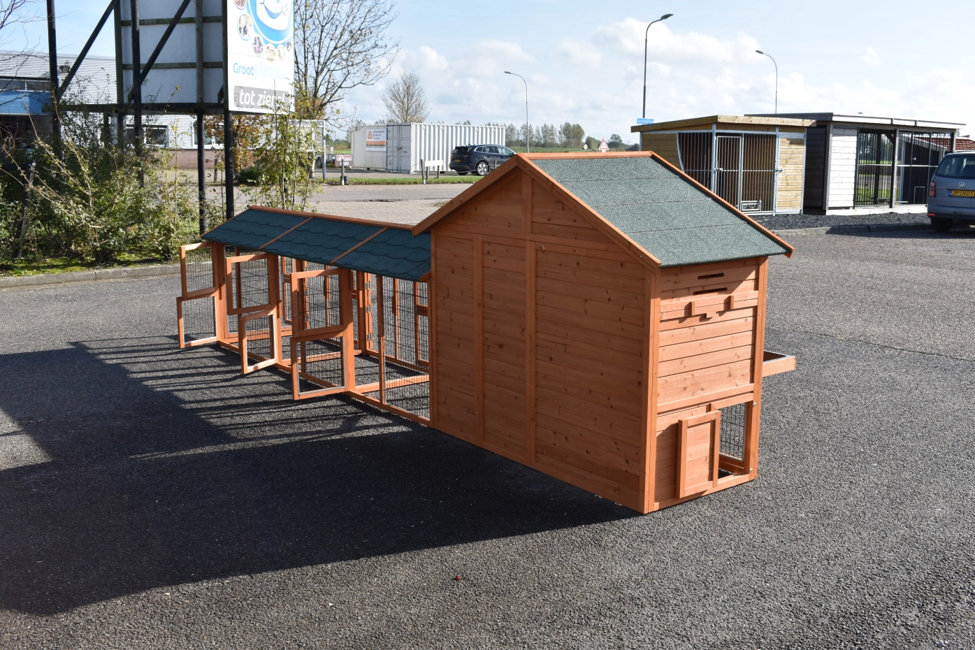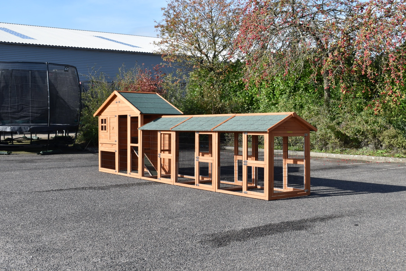 - Pour combiner enclos et poulailler, un panneau de treillis et / ou une porte doit être enlevé