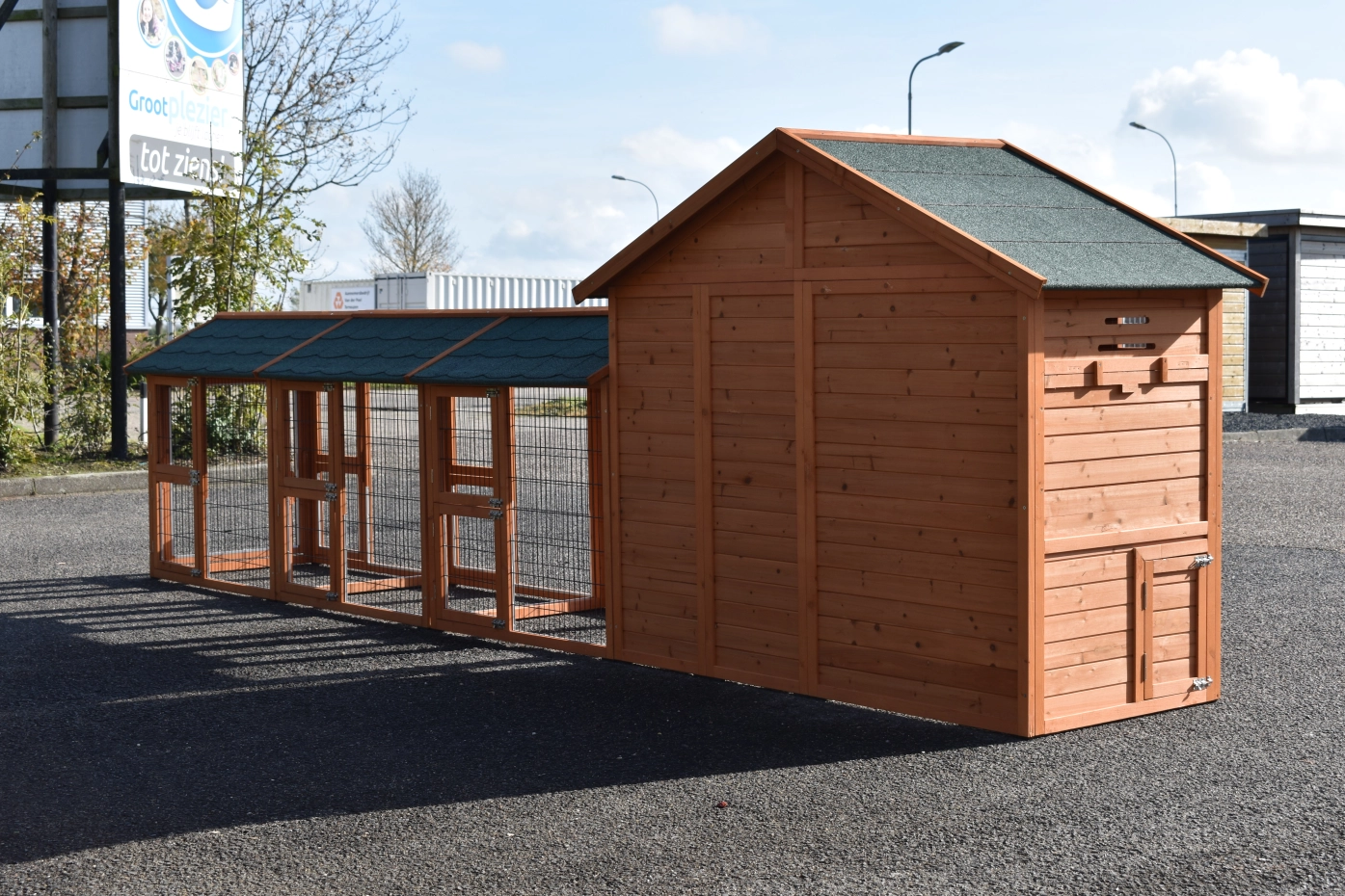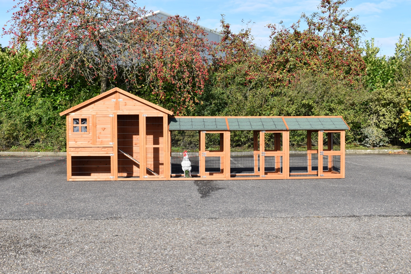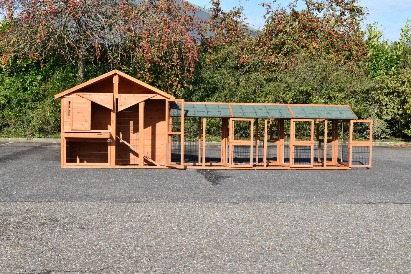 Le poulailler Holiday Medium offre un bel espace extérieur pour vos poules. Le clapier a grande portes et a pieds en caoutchouc. It has a practical tray pour nettoyer de l'abri de nuit. Au-dessous du toit est une grenier de stockage. Le toit est équipée avec toit bitumé. Entre les étages est une rampe. Le clapier est approprié pour 3 à 5 poules.