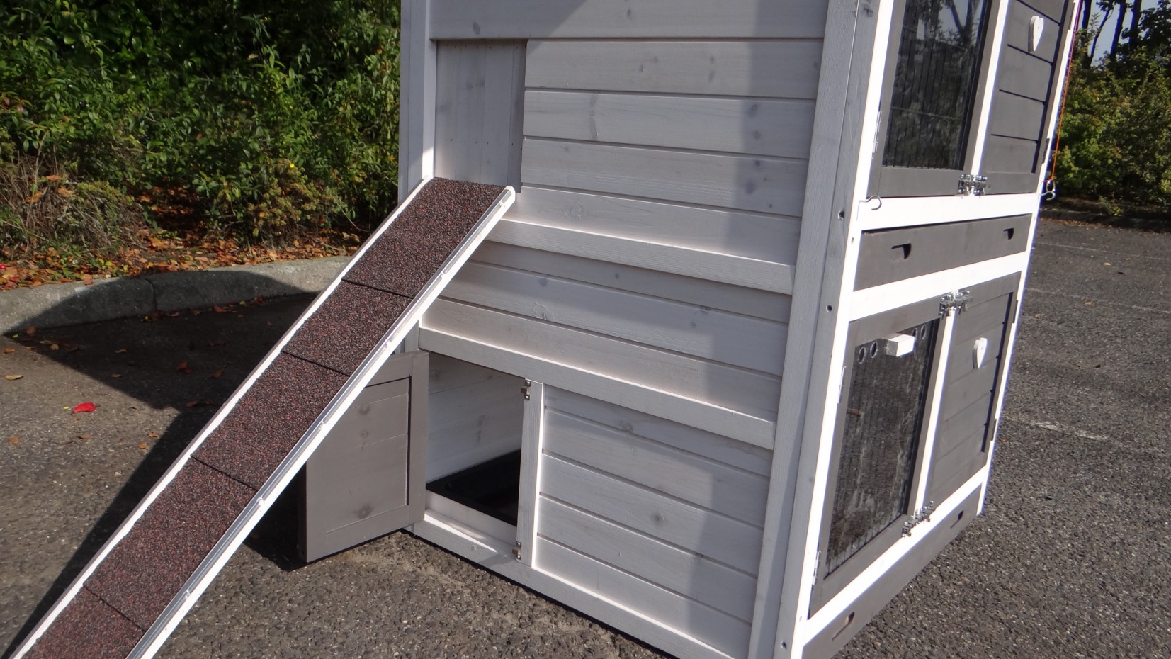 Il est conseillé de traiter périodiquement les charnières et les serrures avec un spray en silicone ou un spray pour serrures pour éviter la rouille et la corrosion. Si l'animal n'est pas dans un endroit abrité, nous vous conseillons d'ancrer l'enclos.