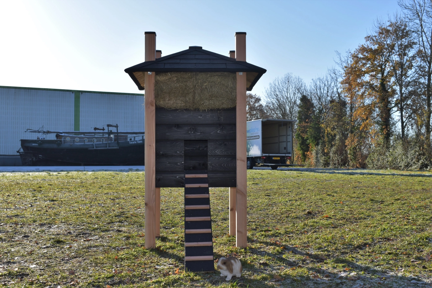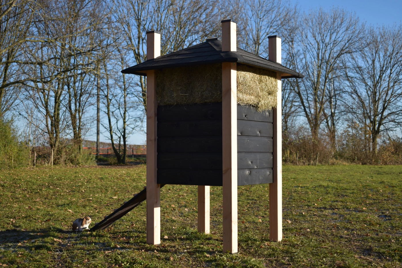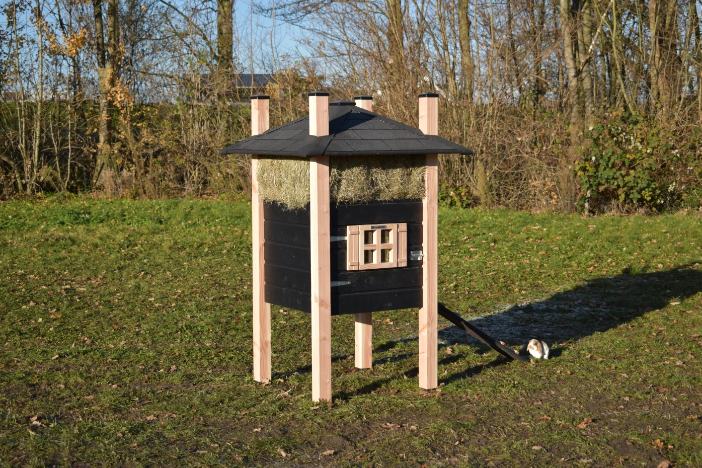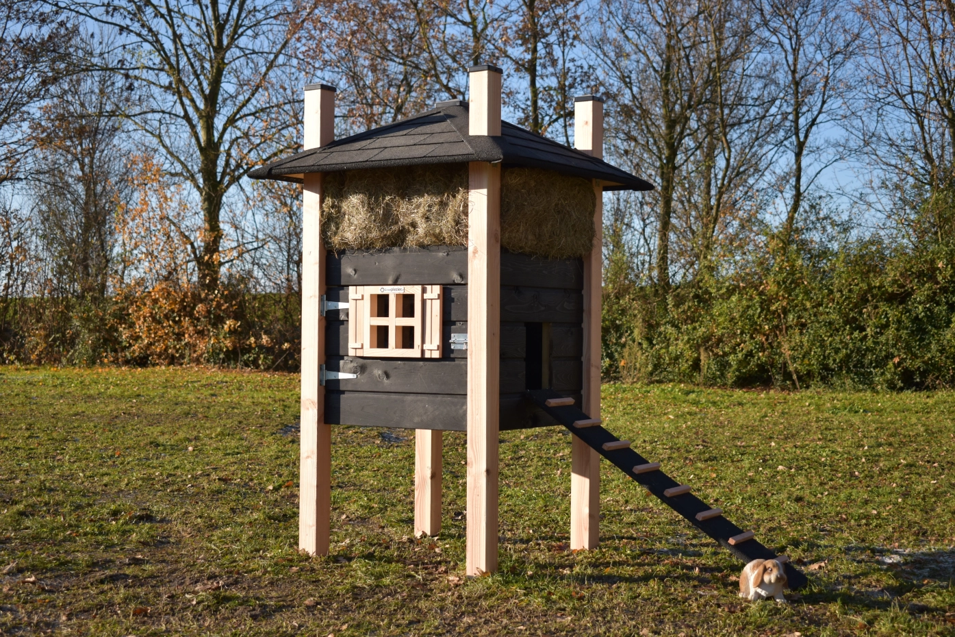 Clapier pour lapin botte de foin Rosa est un achat pour votre jardin. Le clapier est fabriquée en bois de Douglas et bois d'épicéa impregné noir. L'abri de nuit est équipée avec une fenêtre. Le clapier se dresse haut sur ses pattes, ce qui permet aux lapins de s'abriter en cas de mauvais temps.