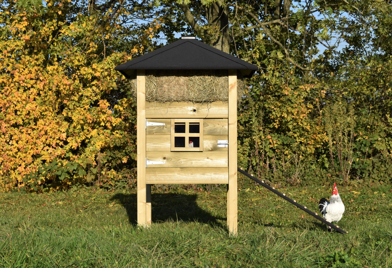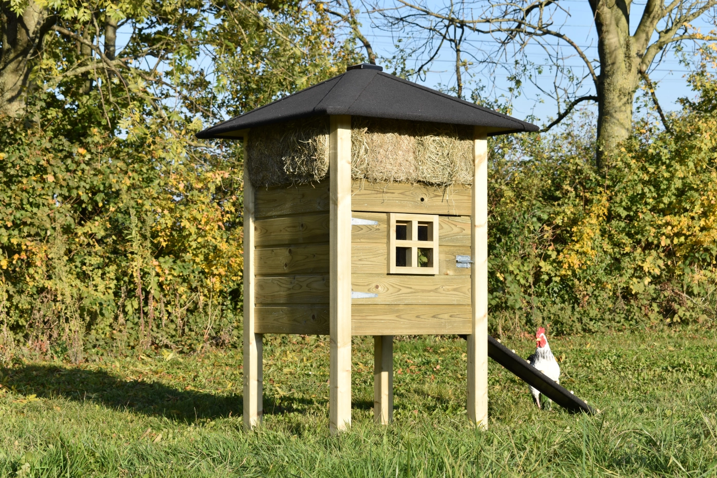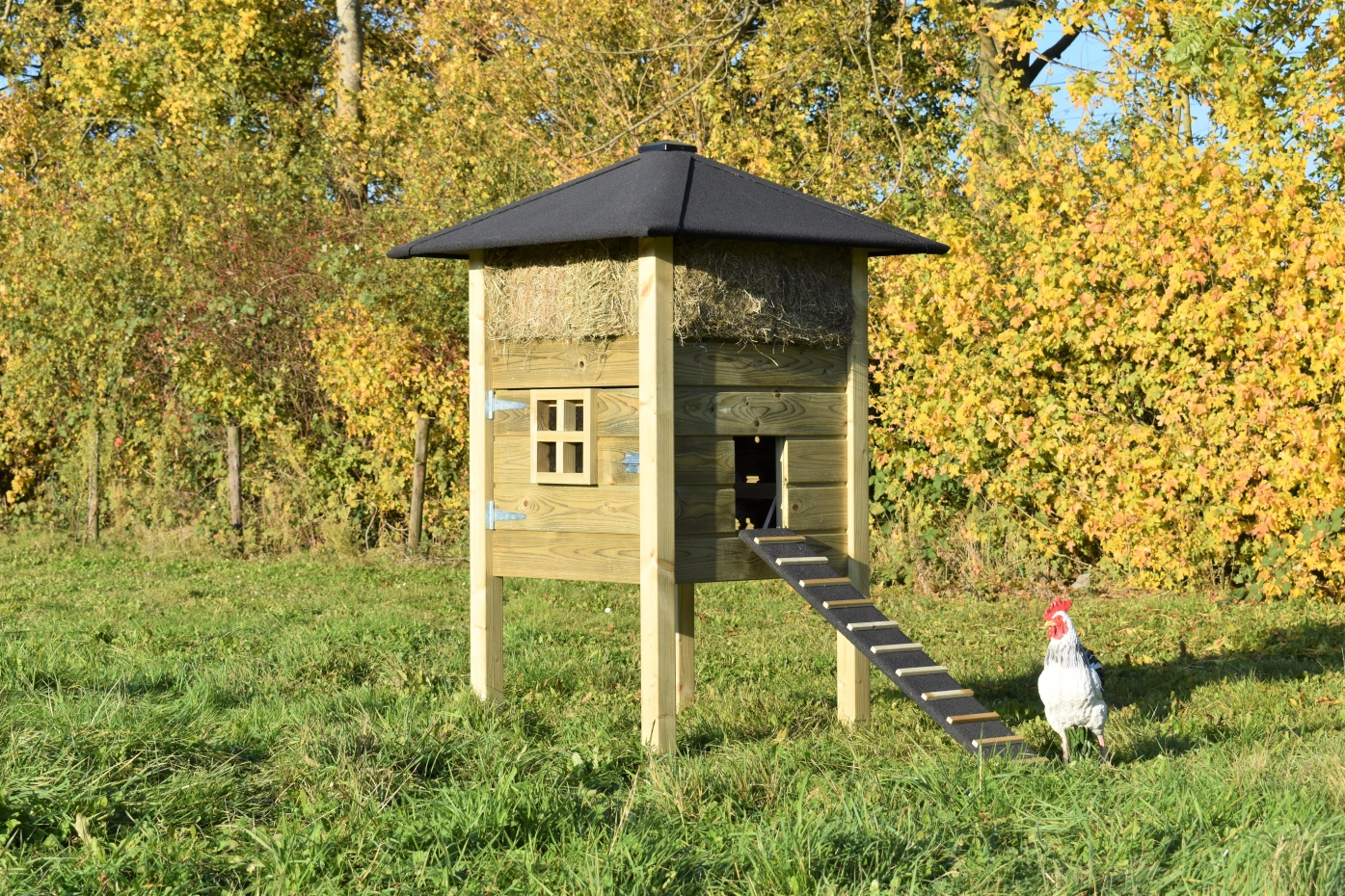 Clapier pour lapin botte de foin Rosanne est fabriquée en bois d'épicéa impregné. Vous pouvez commander du foin aussi. A cause de la grande porte vous pouvez nettoyer l'abri de nuit facilement. Le clapier est aussi disponible avec bardeaux de toit.