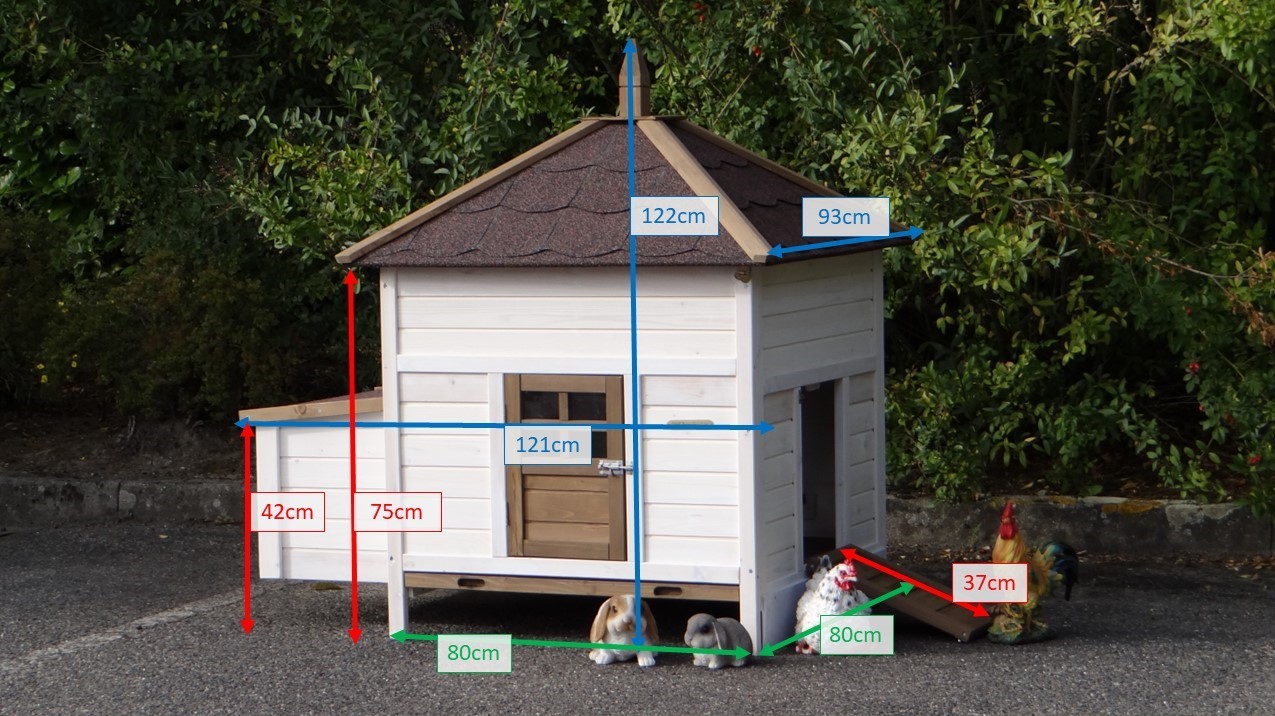 | Dimensions extérieures incluant le toit et nichoir (LxPxH) | 121x93x122cm |