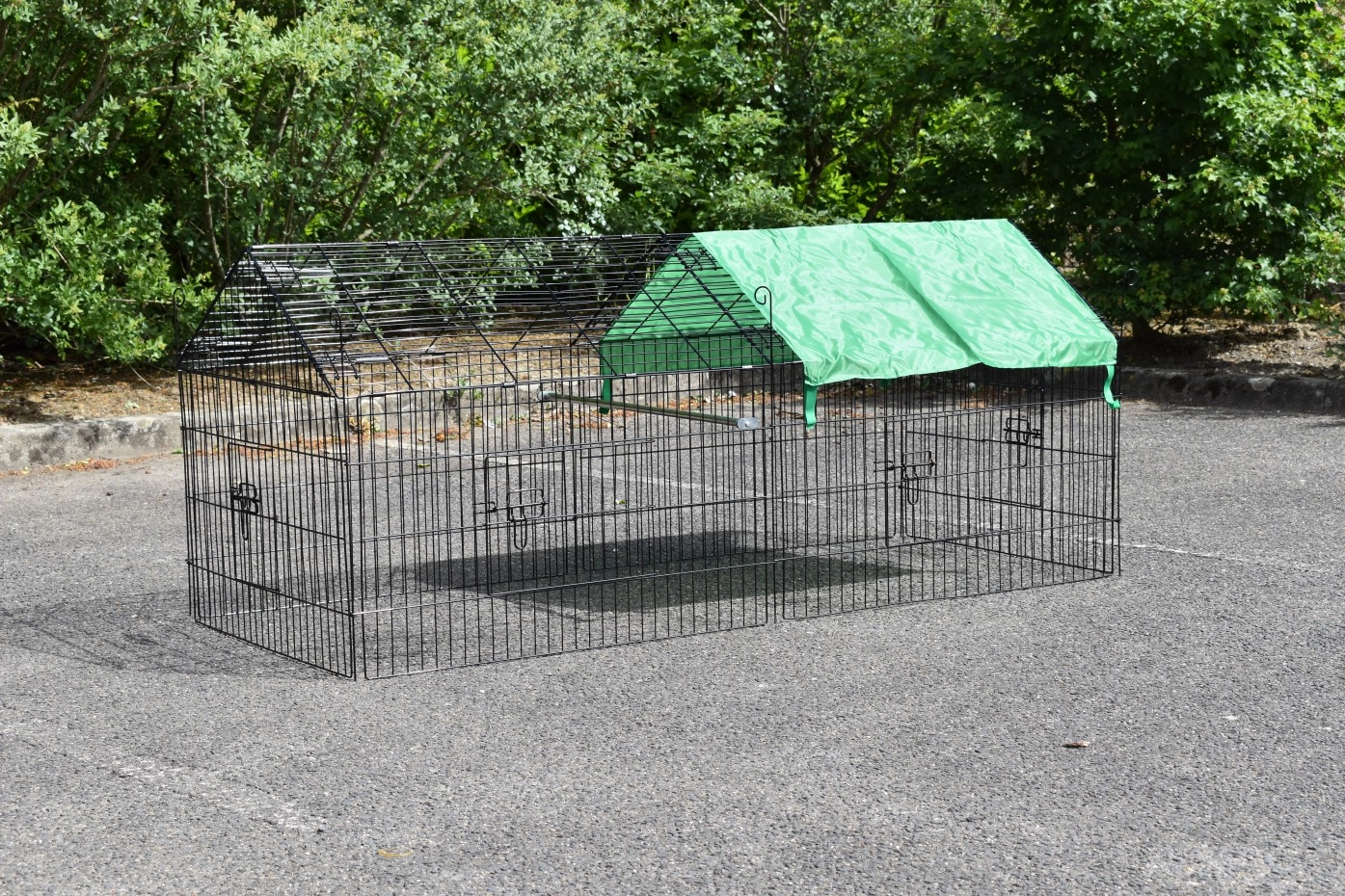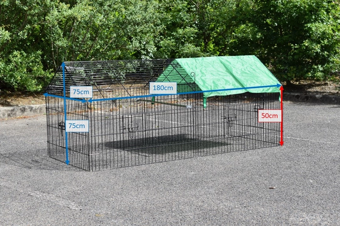 L'enclos pour lapins Elynn avec parasol est un enclos, fabriqué en acier noir à revêtement en poudre. C'enclos pour lapins avec parasol peut être utilisé comme enclos pour lapins, poules, chats et chiots. C'enclos pratique avec parasol est équipé de 4 portes dans les grilles. L'enclos pour lapins est extensible à l'infini, et généralement facile à combiner avec un poulailler ou un clapier à lapins, ou un autre clapier pour animaux. Le côté de cette piste (la partie raide) est d'environ 50 cm de haut.