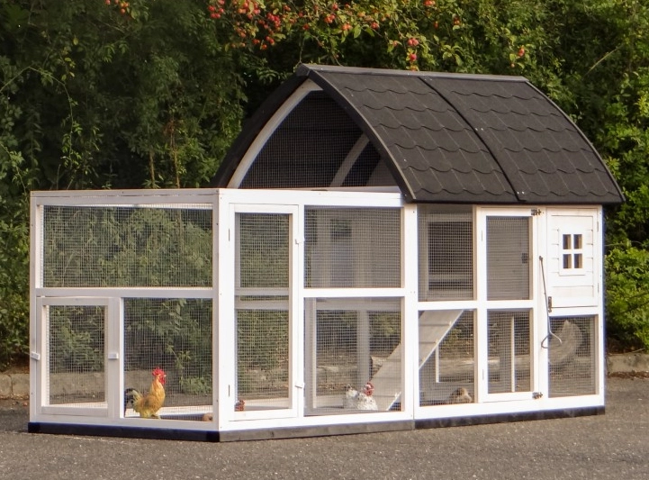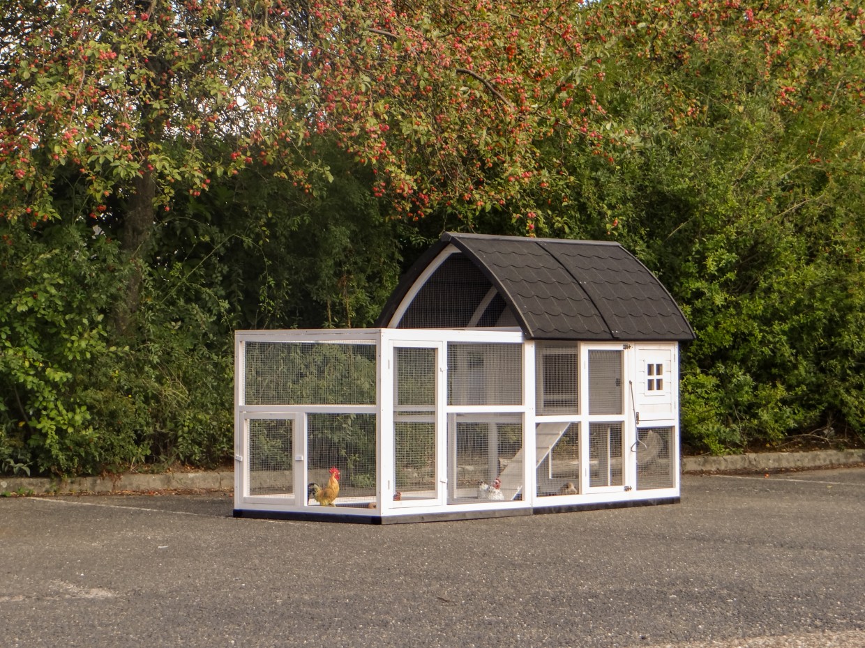 - Pour combiner enclos et poulailler, un panneau de treillis et / ou une porte doit être enlevé