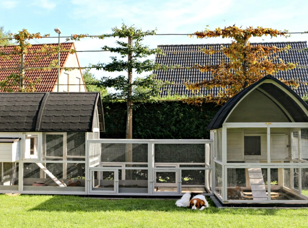 - Pour combiner enclos et poulailler, un panneau de treillis et / ou une porte doit être enlevé