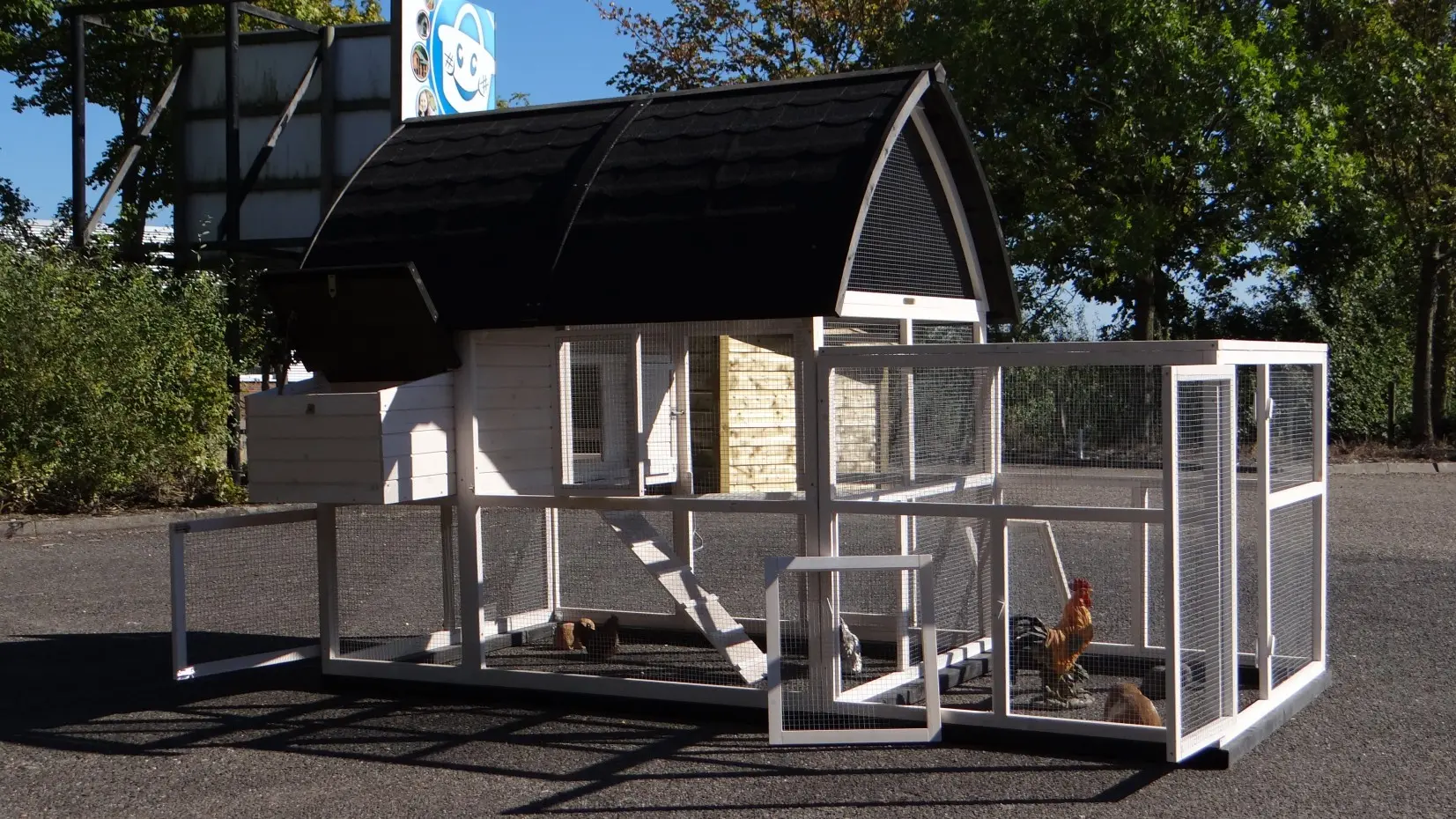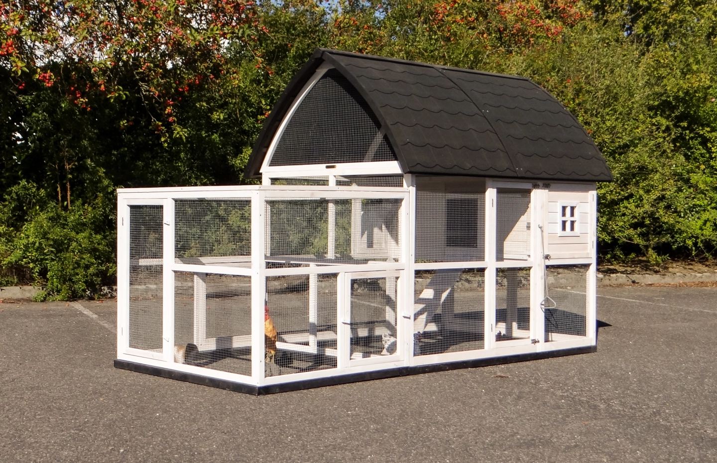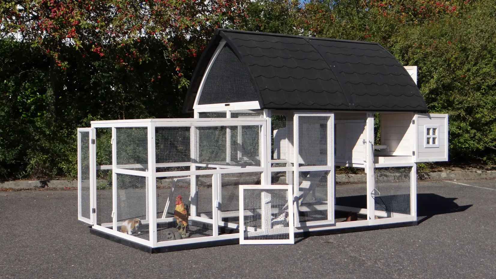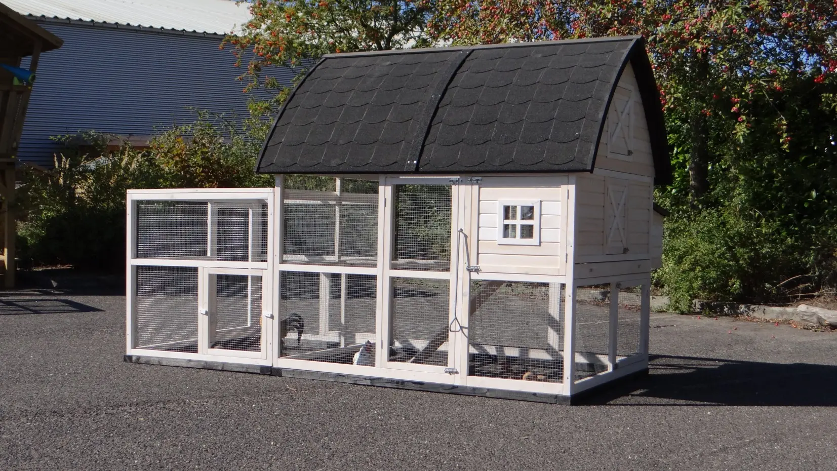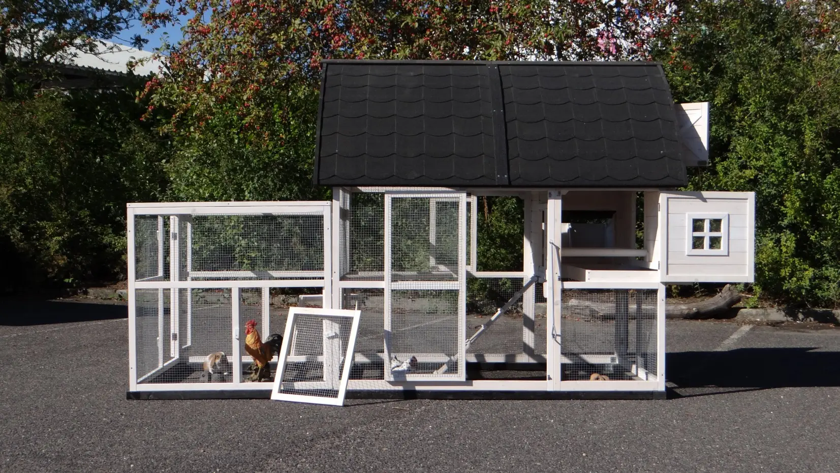 - Pour combiner enclos et poulailler, un panneau de treillis et / ou une porte doit être enlevé