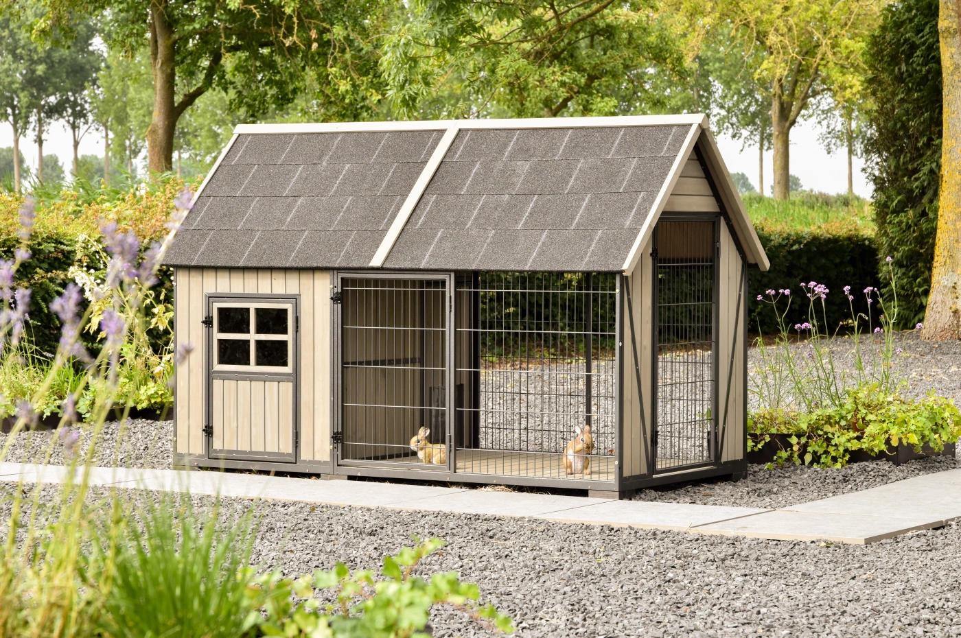 Avec son toit pointu caractéristique, ses trois portes d'accès et son sol en bois, ce clapier est à la fois pratique et agréable à utiliser.