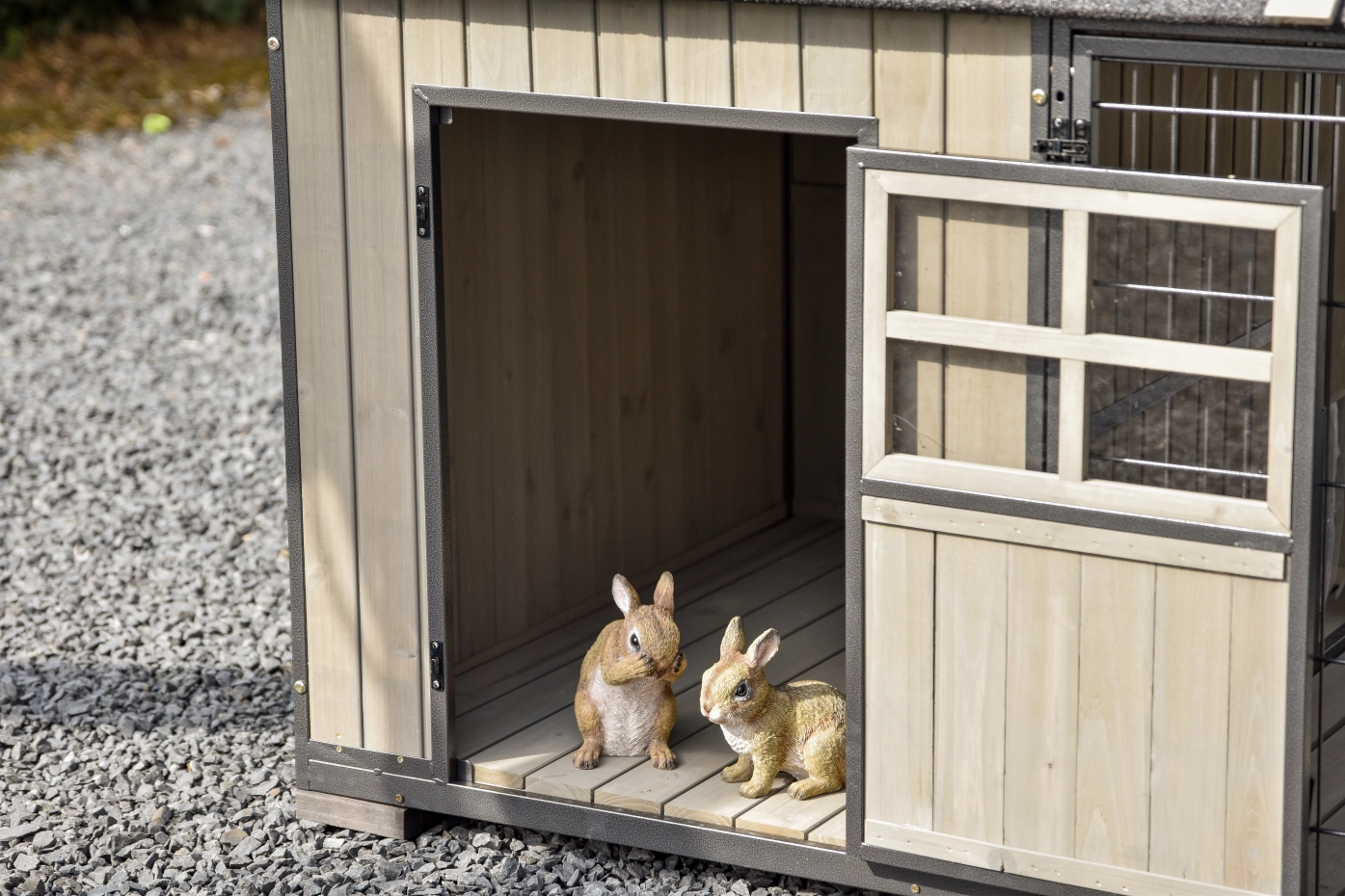 Le grand abri de nuit offre protection et repos, tandis que l’enclos spacieux permet aux lapins de bouger et de sauter librement.