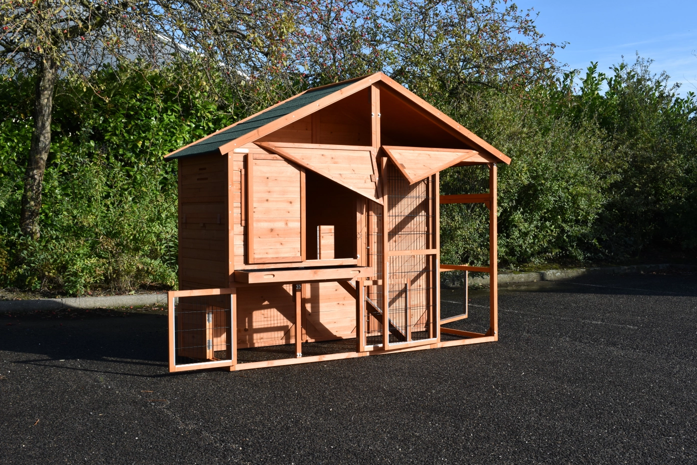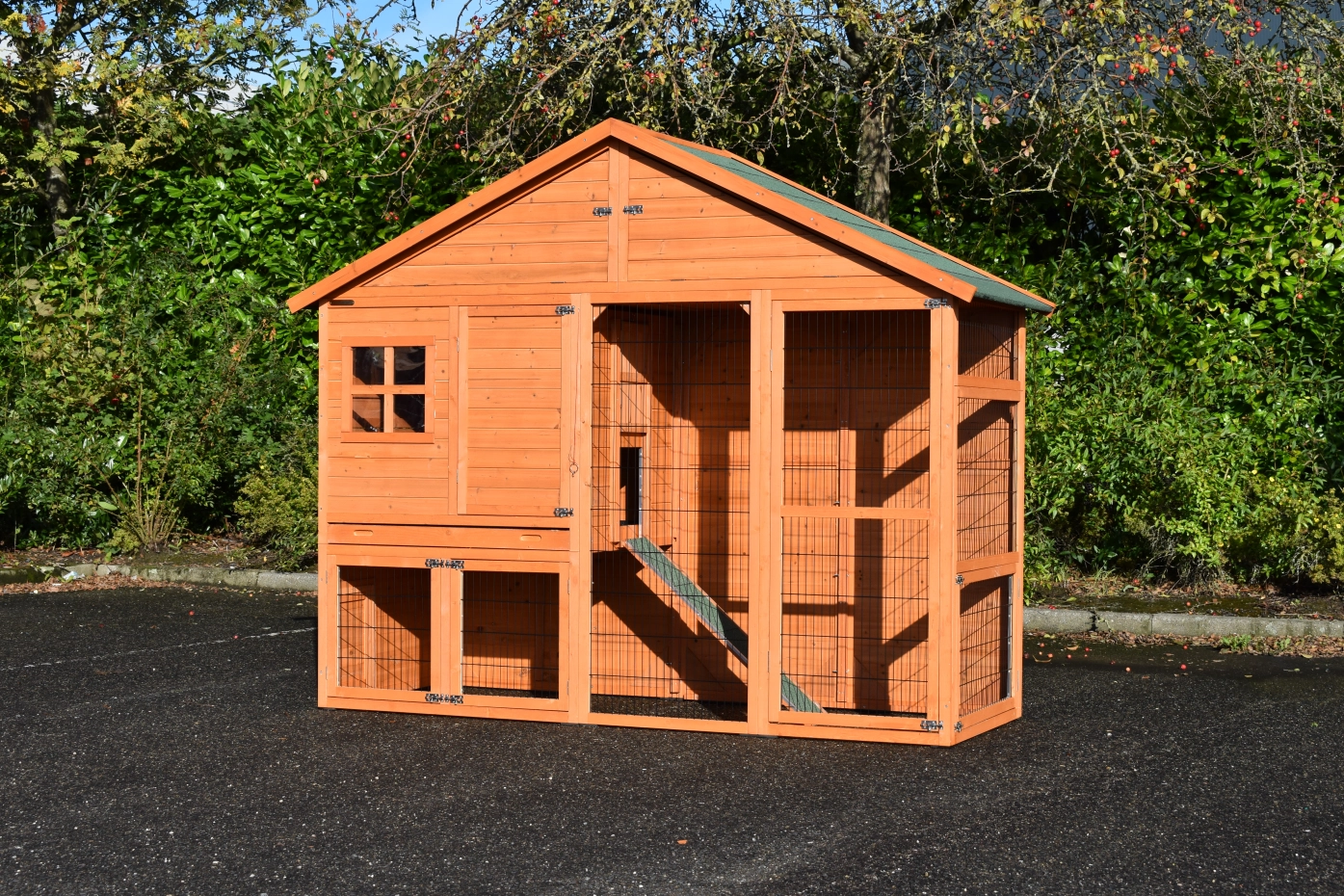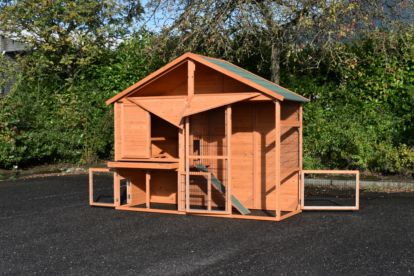 Clapier pour lapin Holiday Large est une belle clapier pratique, fabriquée en qualité supérieure. Le Holiday Large a un grand abri de nuit, un grand enclos et grande portes avec anti-mordillage. Le grande porte sur l'avant droit a les dimensions 55x131cm. La porte dans l'avant de l'abri de nuit est 41x69. Les max. dimensions ont 241x96x195cm .