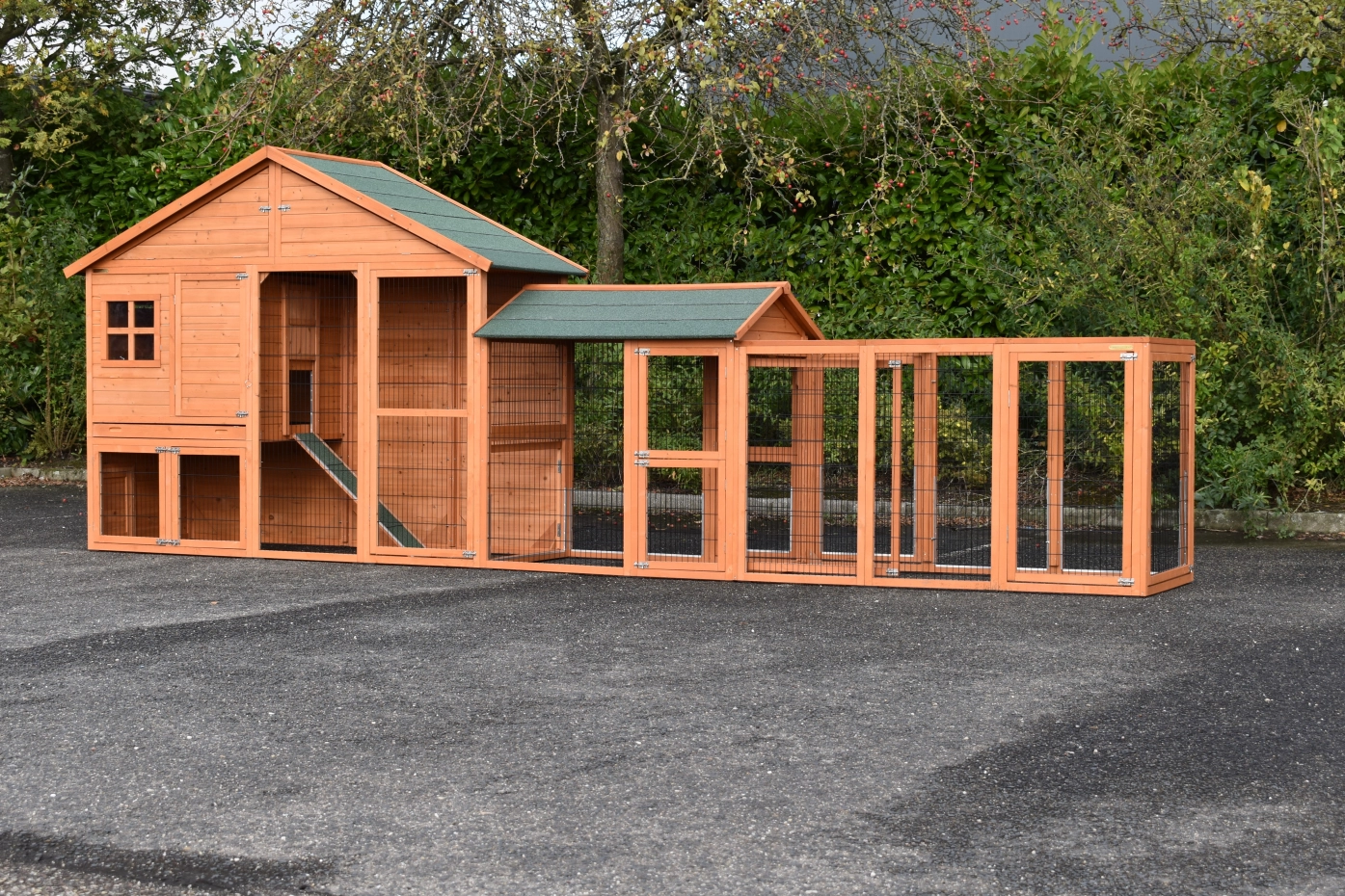 - Pour combiner enclos et poulailler, un panneau de treillis et / ou une porte doit être enlevé