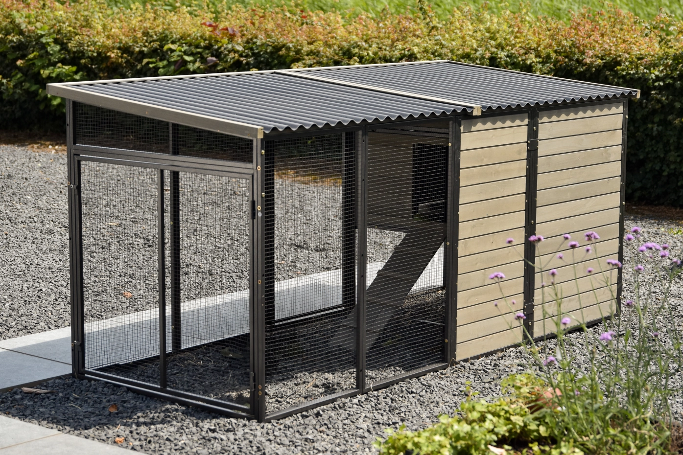 - Abri pour animaux en bois de pin avec cadre, en acier robuste et grillage noir