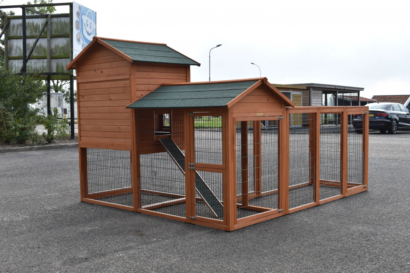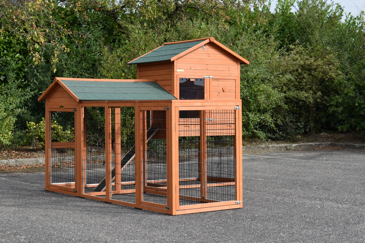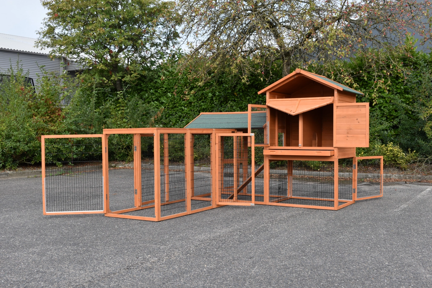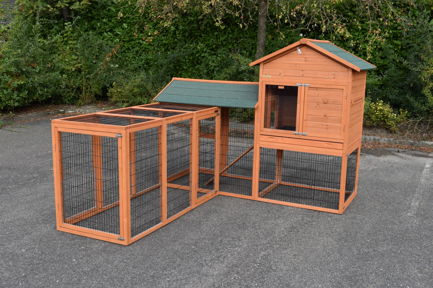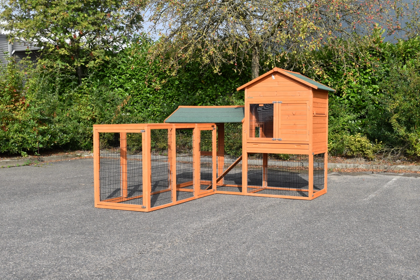 Le clapier pour lapin Prestige Large est équipée avec 2 enclos, quelques ont placée dans un unité d'angle. Un bel clapier, approprié pour 2 à 4 lapins.