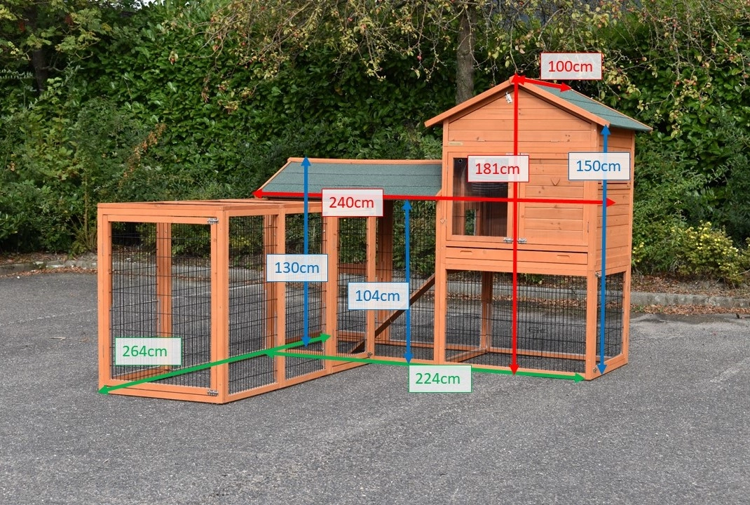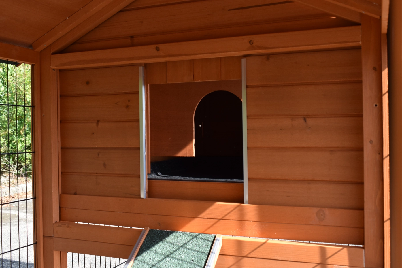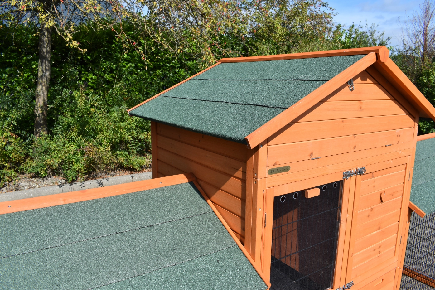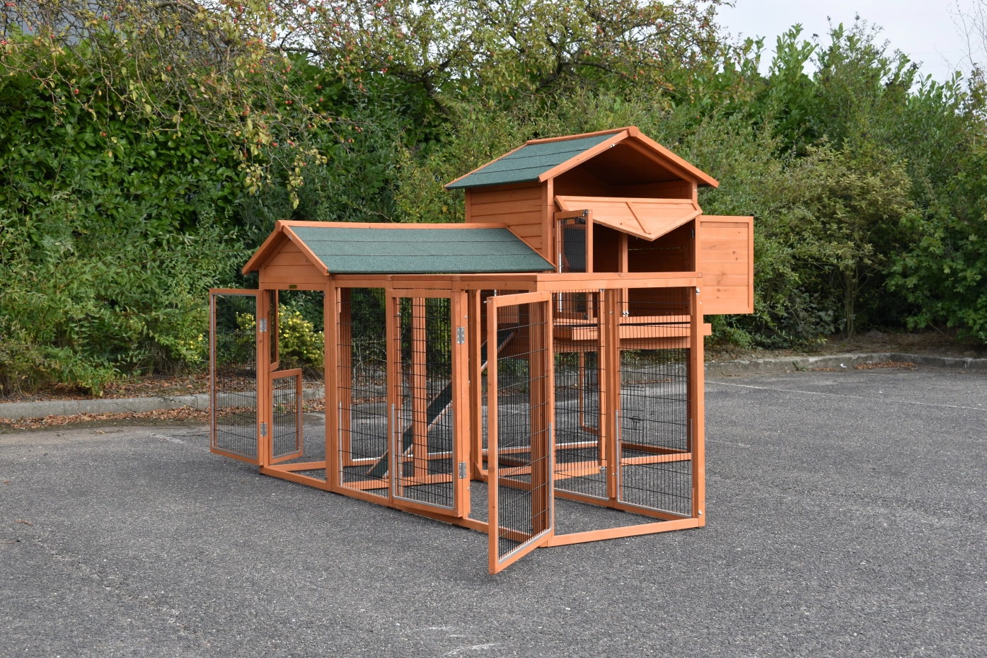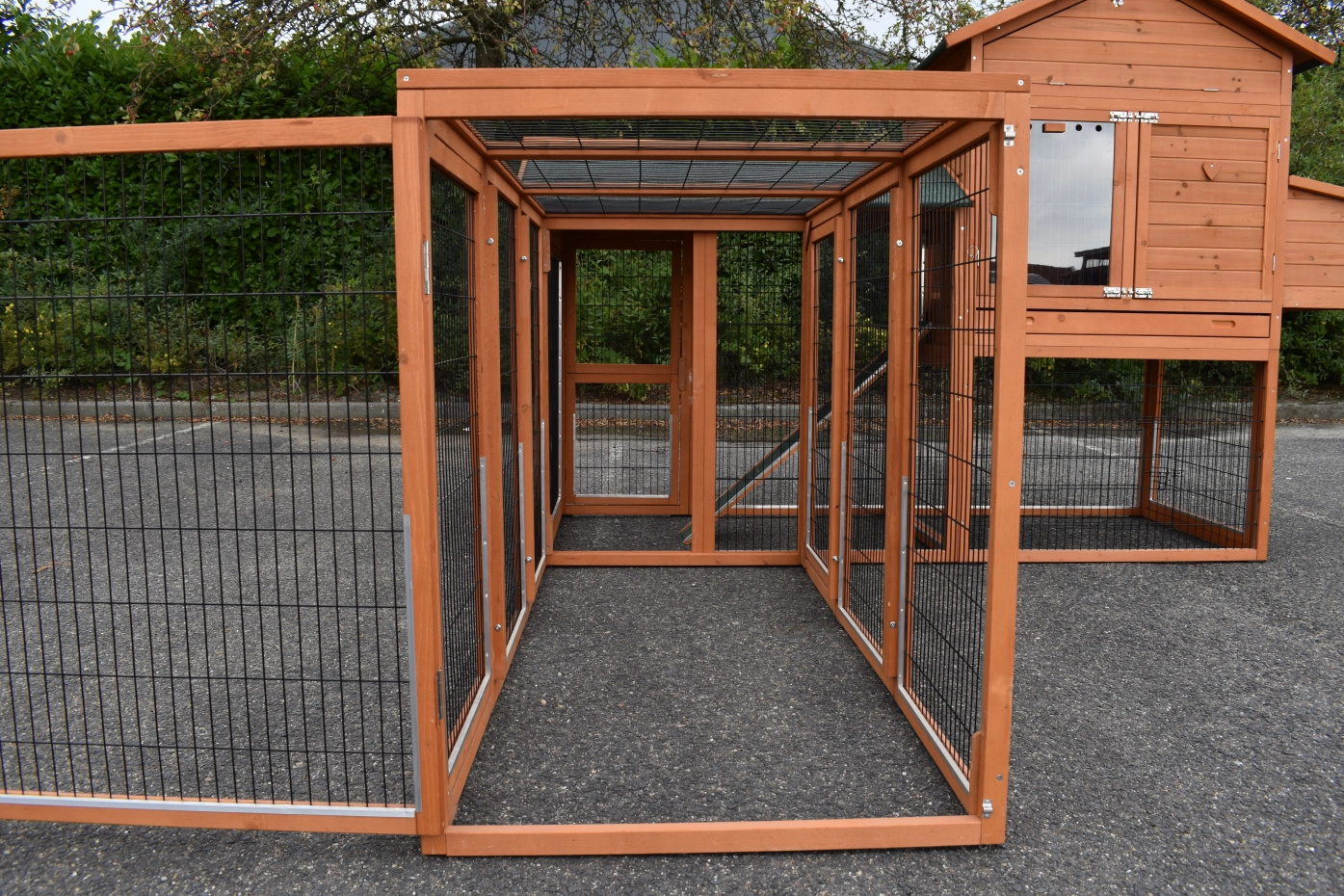 Le clapier pour lapin Prestige Large est équipée avec 2 enclos, quelques ont placée dans un unité d'angle. Un bel clapier, approprié pour 2 à 4 lapins.
