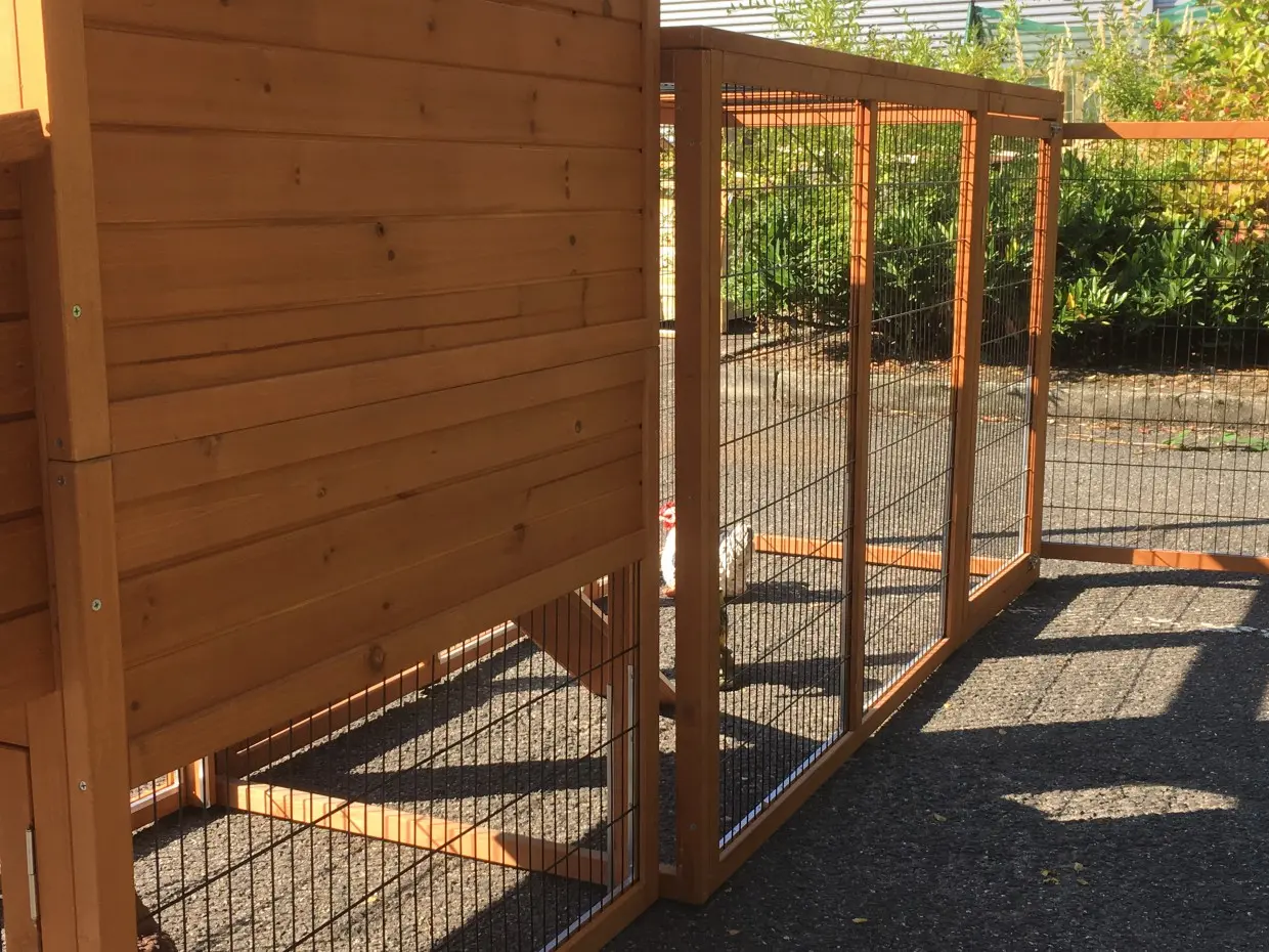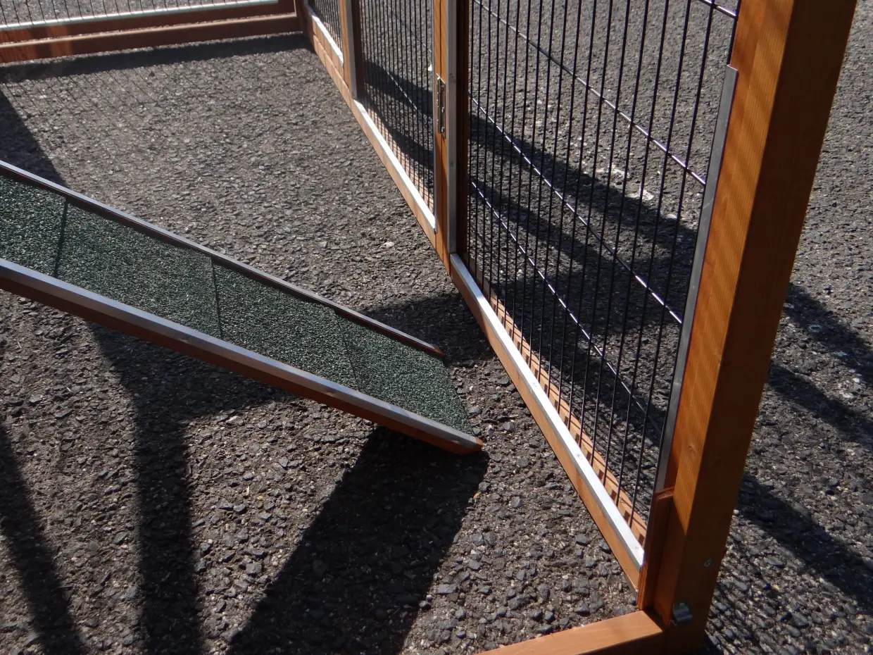 - Pour combiner enclos et poulailler, un panneau de treillis et / ou une porte doit être enlevé