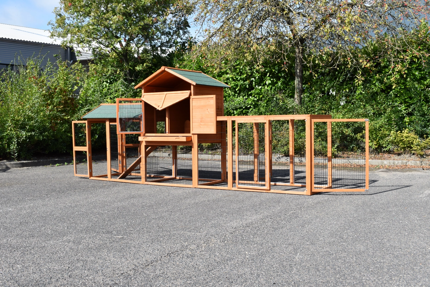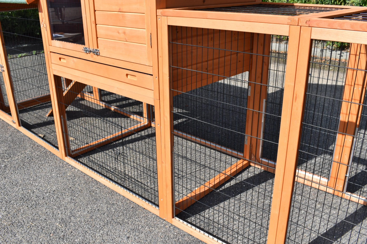 - Pour combiner enclos et poulailler, un panneau de treillis et / ou une porte doit être enlevé