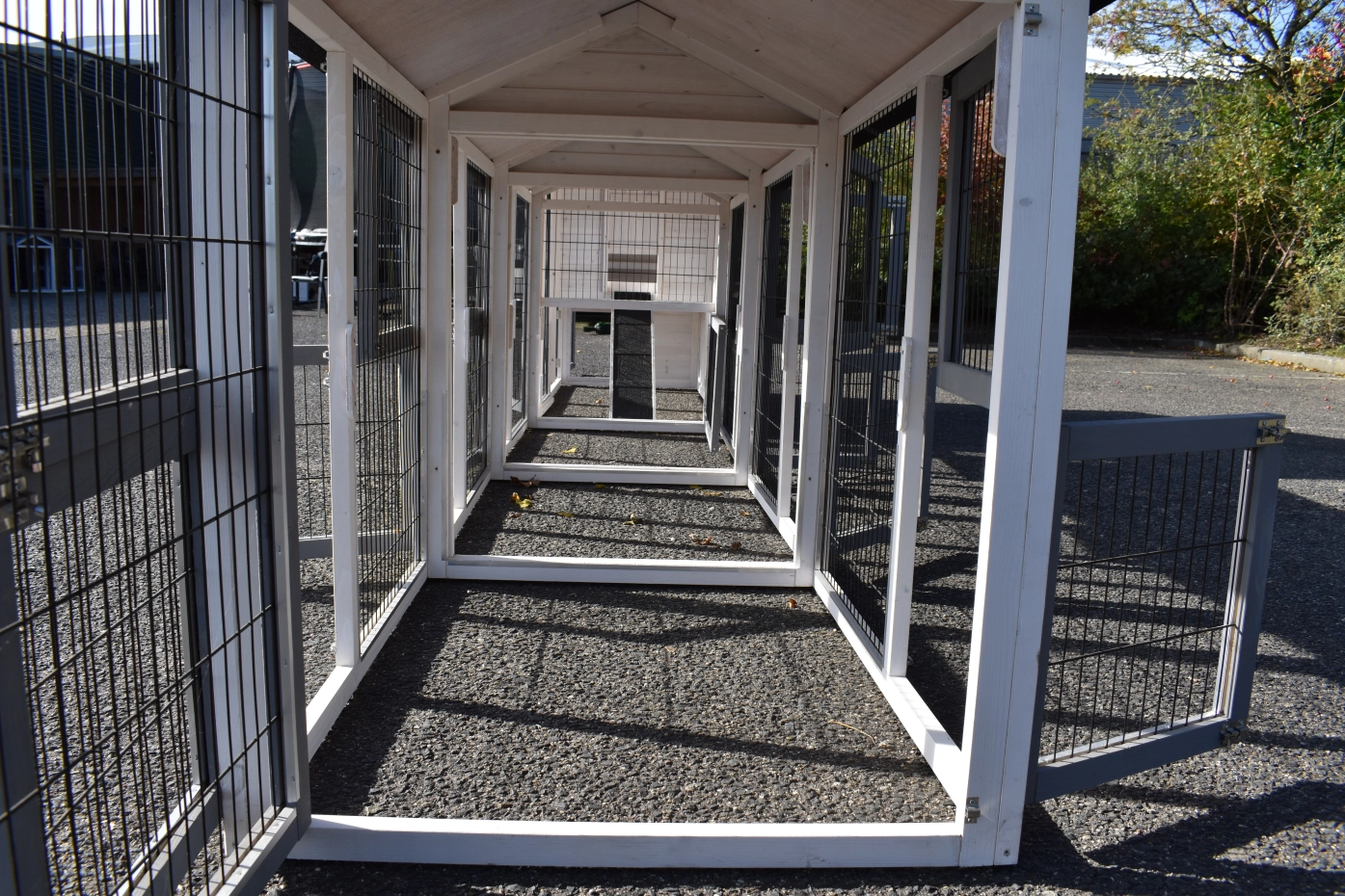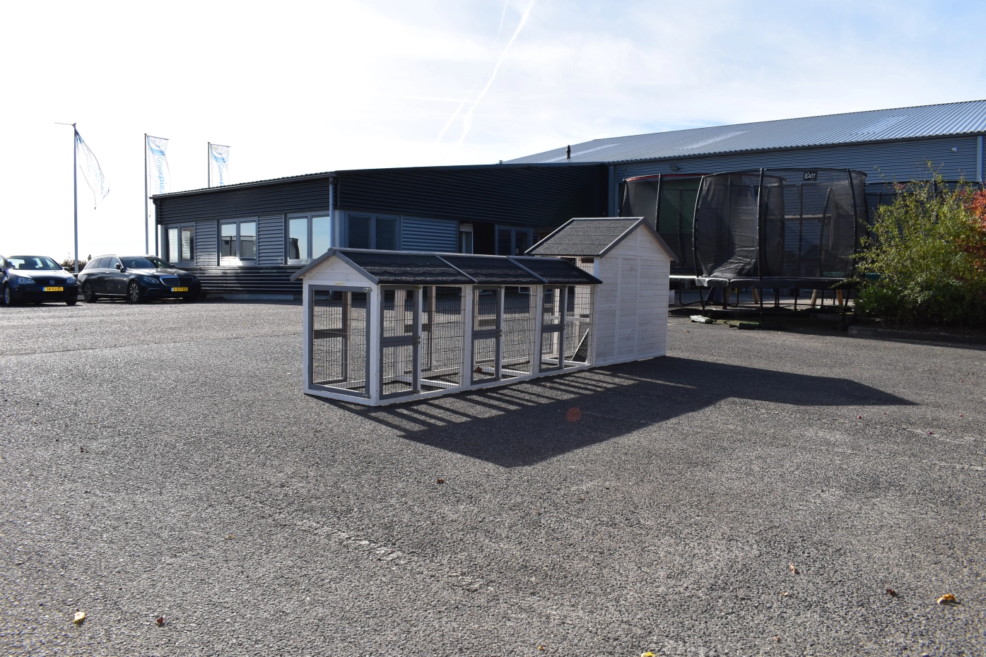- Pour combiner enclos et poulailler, un panneau de treillis et / ou une porte doit être enlevé