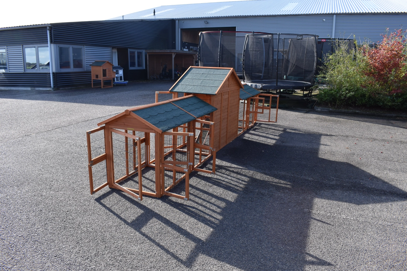- Pour combiner enclos et poulailler, un panneau de treillis et / ou une porte doit être enlevé