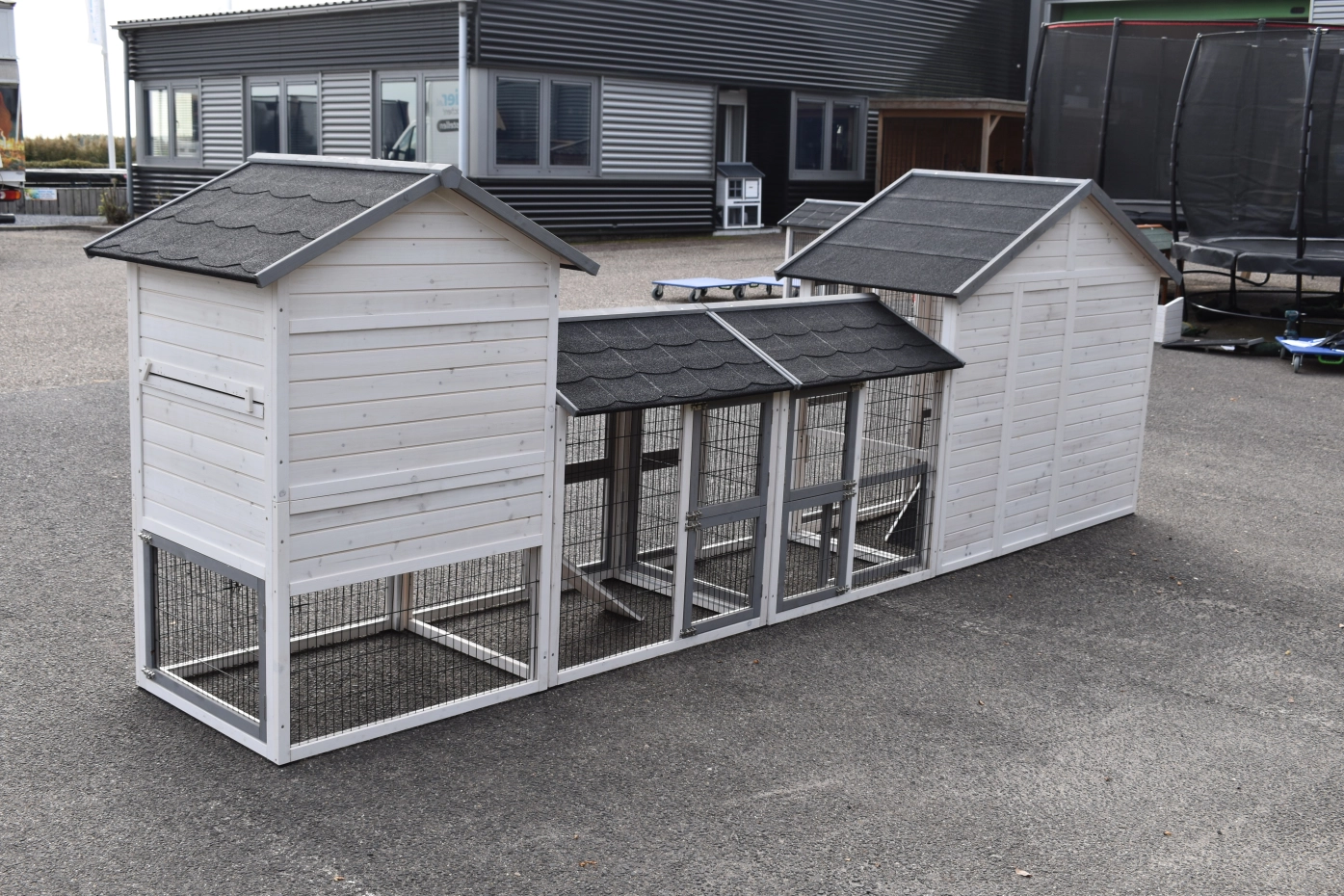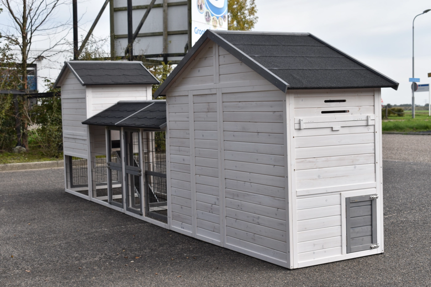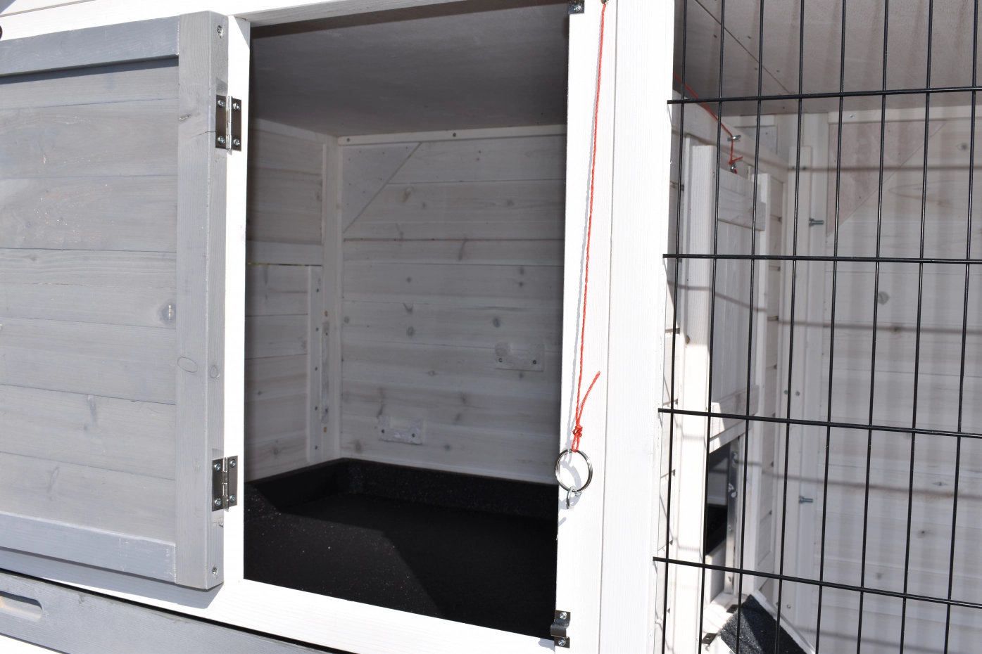 - Pour combiner enclos et poulailler, un panneau de treillis et / ou une porte doit être enlevé