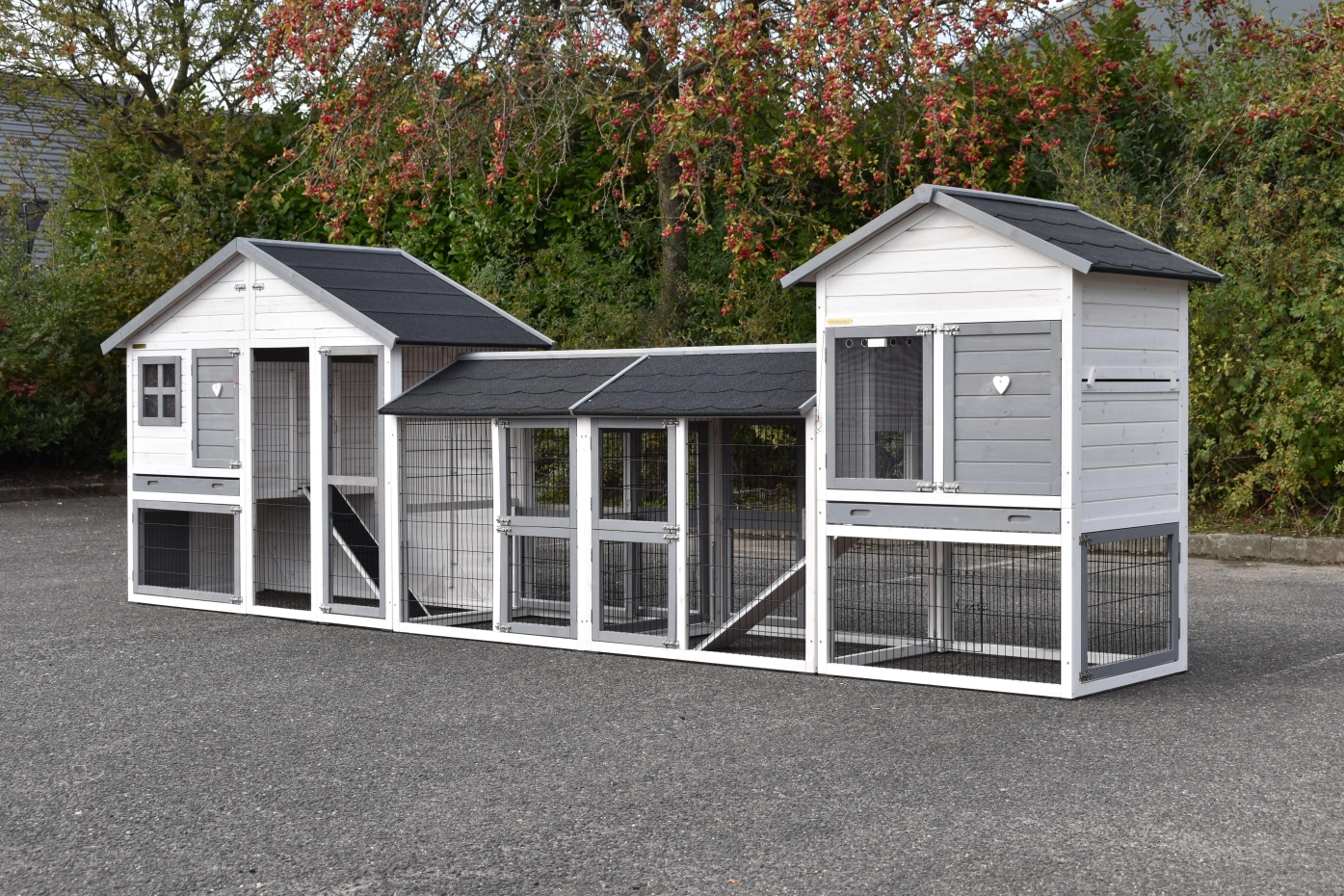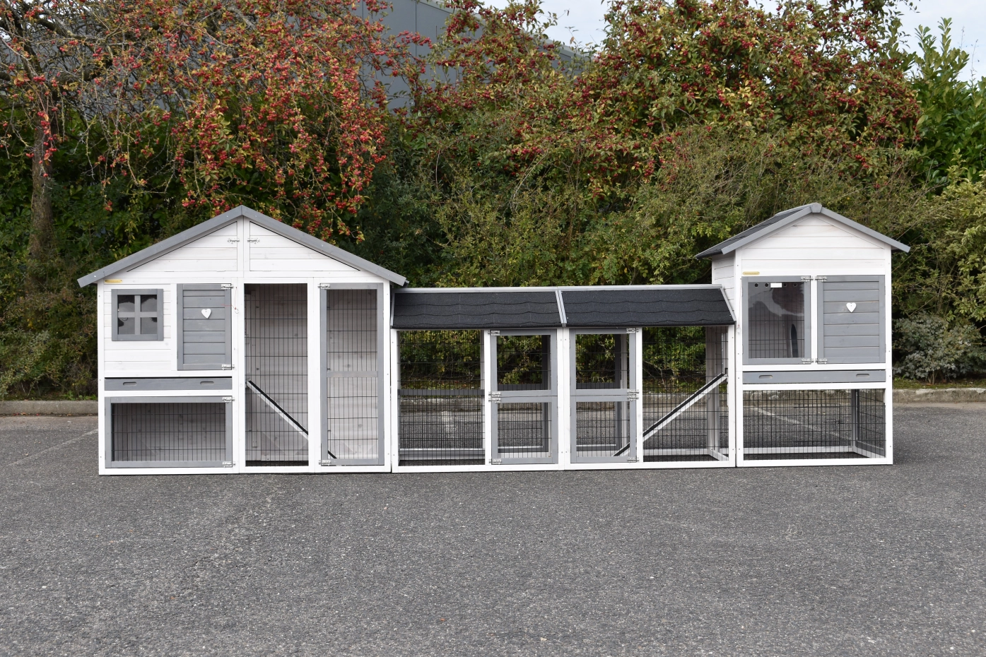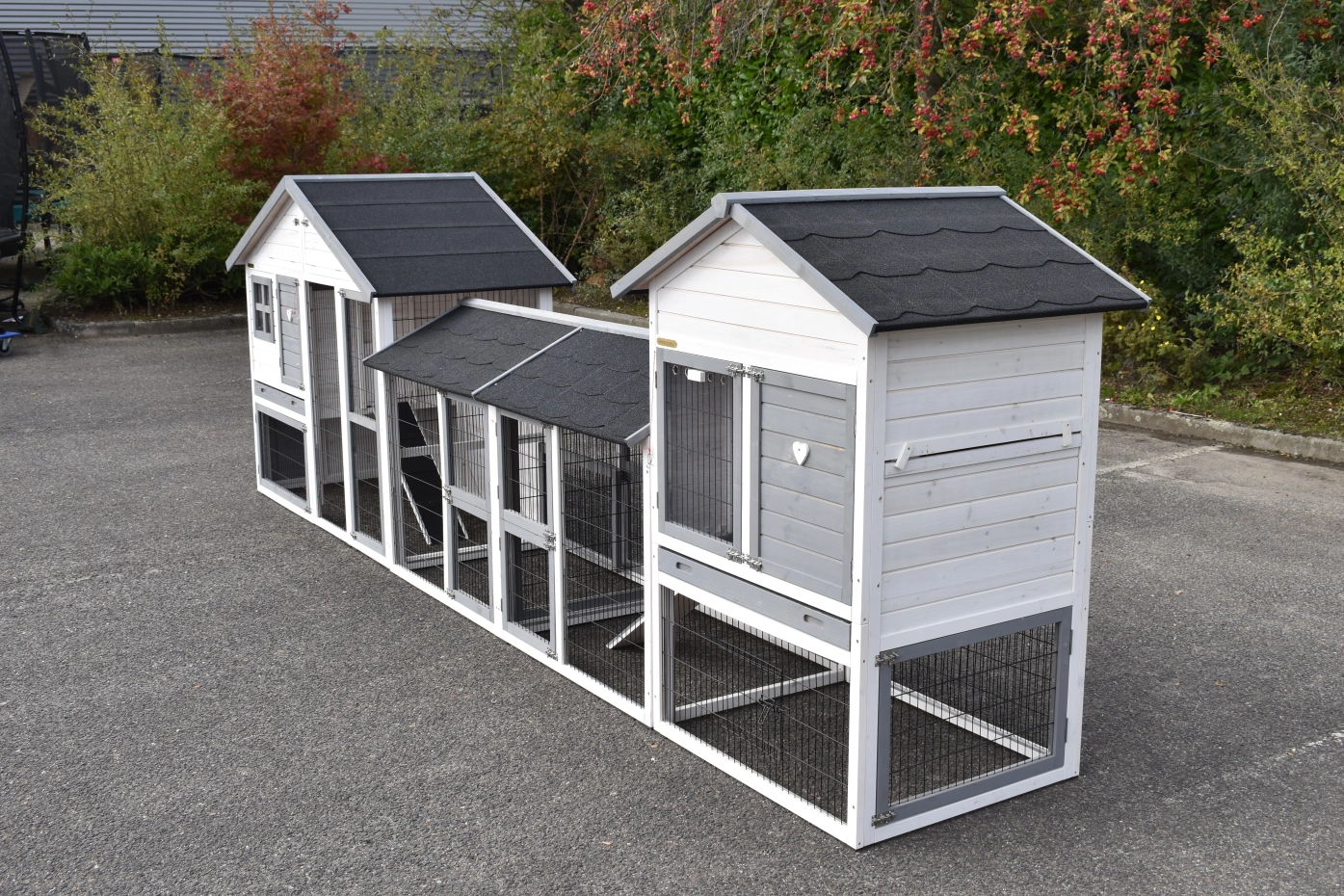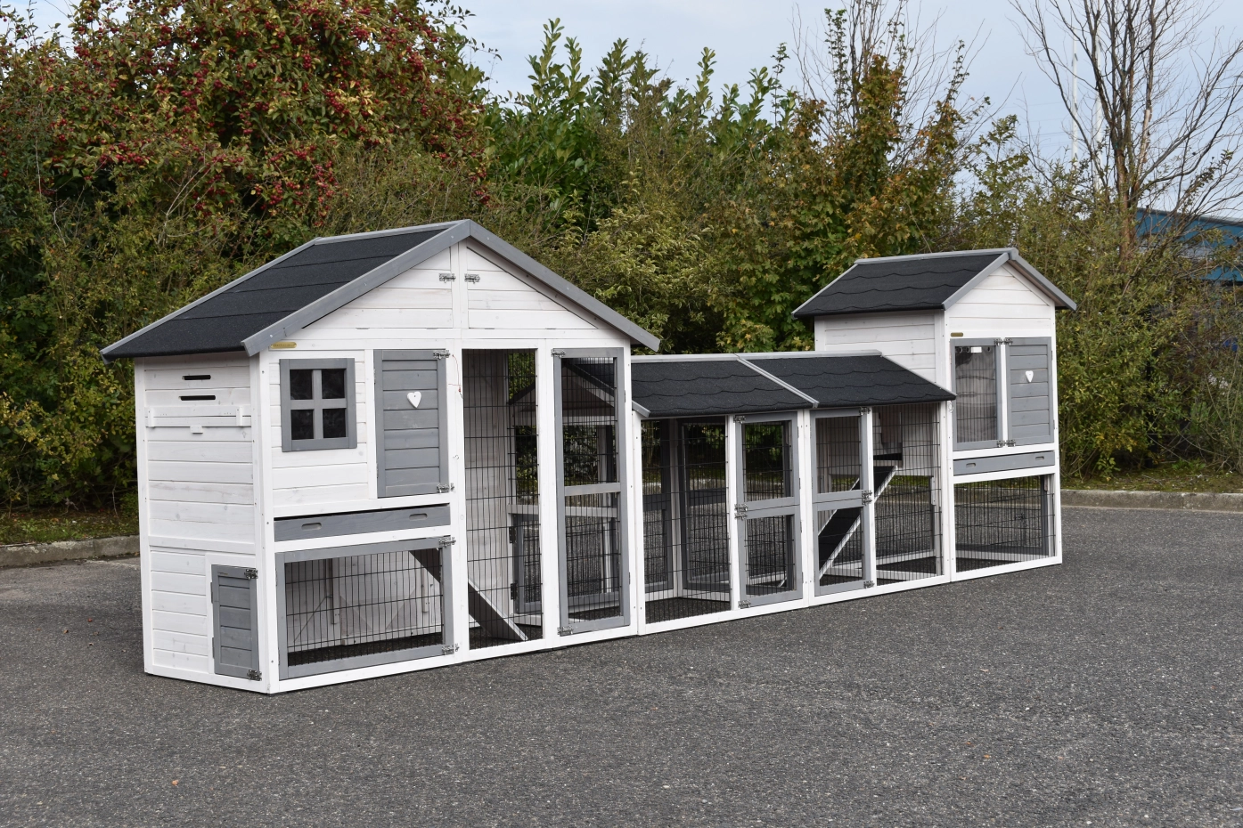Cage à lapins Holiday Medium a été agrandie avec la cage Prestige Medium et 2 enclos. La grande combinaison convient pour 4 à 8 lapins. Les deux cages sont équipées d'un tiroir coulissant et d'un grenier.
