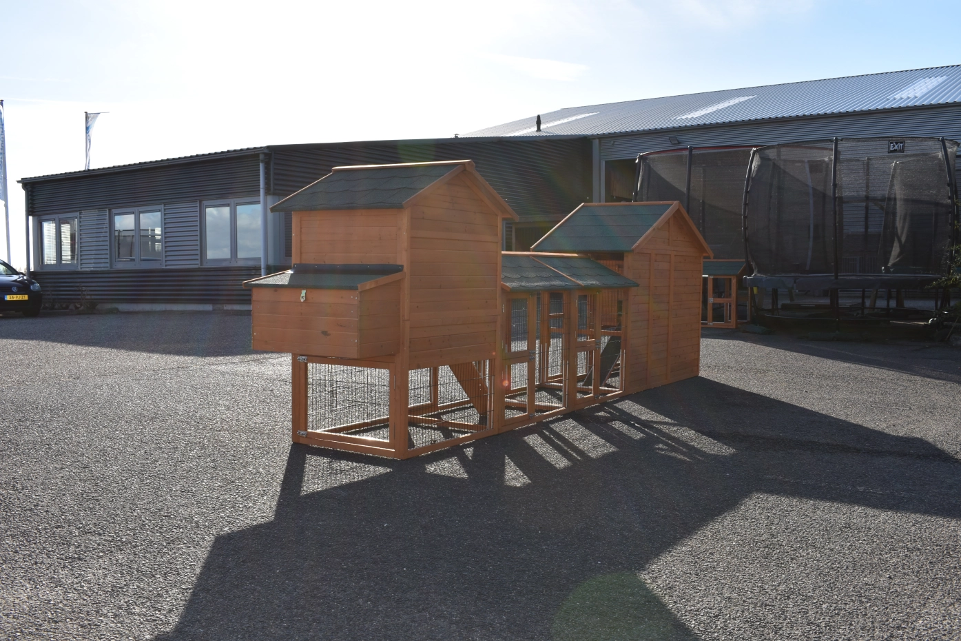 - Pour combiner enclos et poulailler, un panneau de treillis et / ou une porte doit être enlevé