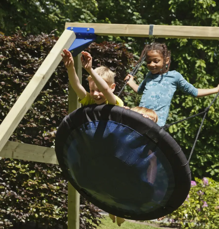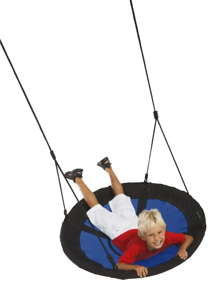 Magnifique balançoire nid ronde pour un plaisir supplémentaire! Solide balançoire nid, pouvant accueillir plusieurs enfants en même temps. La balançoire bleue a des accents noirs et une corde tressée noire.
