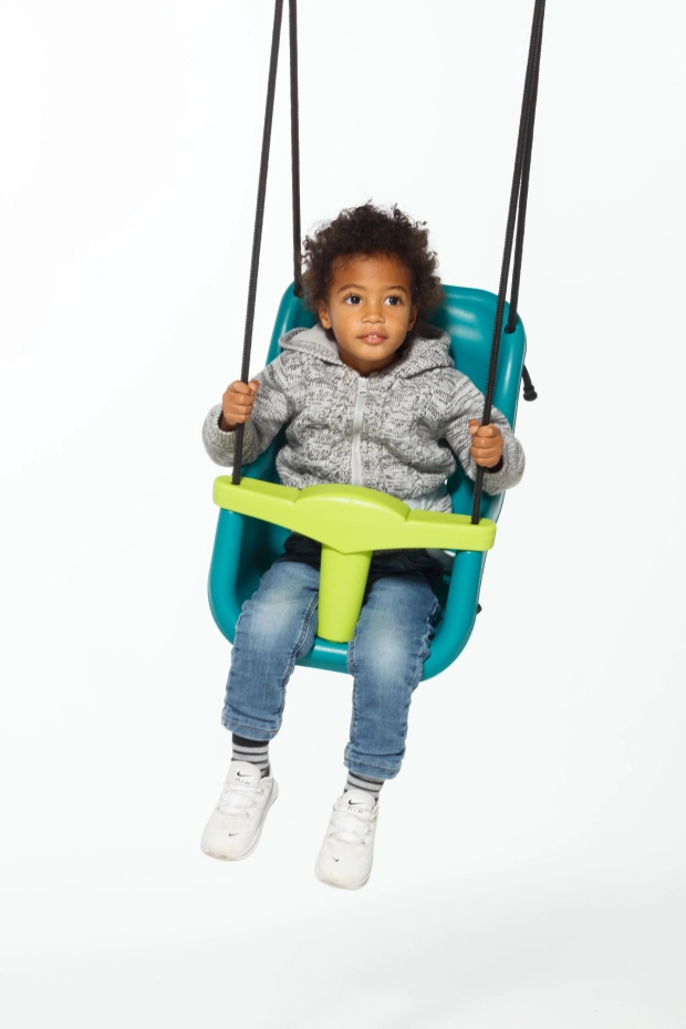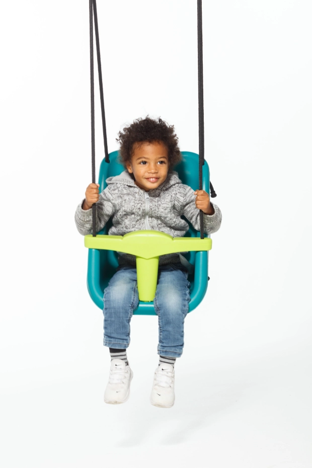 Balançoire bébé 'luxe' en turquoise/vert citron. Une combinaison de couleurs fraîches! Cette balançoire a un dossier extra-haut pour un soutien optimal de la tête et du cou. Siège de balançoire avec barre en T et sangle de sécurité. La corde BR spéciale de cette balançoire ne brûle pas les doigts des enfants.